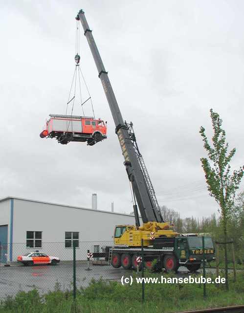 Einer von Thömens 100 Tonnen Telekranen hat ein altes HANSA LF am Haken.