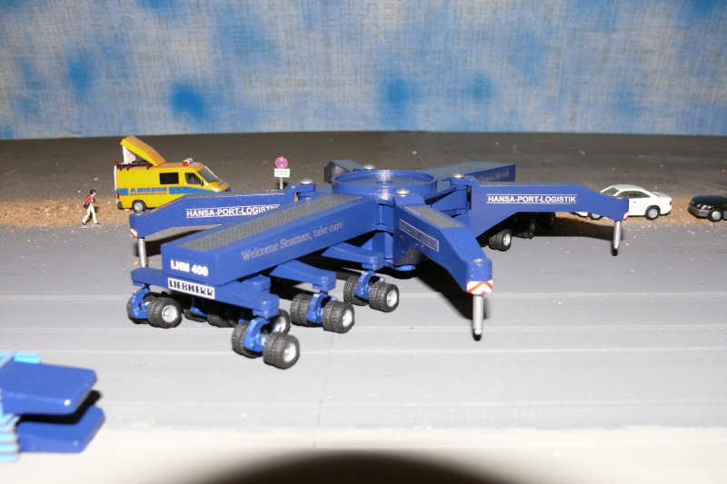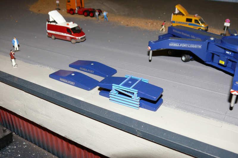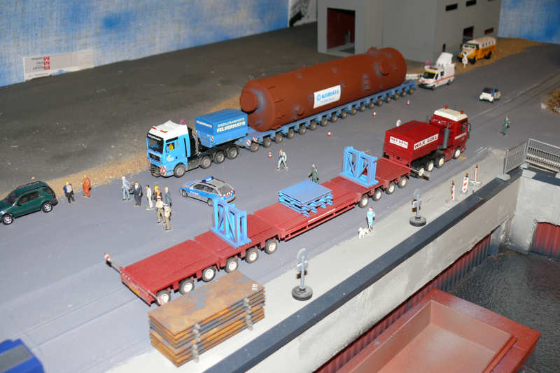 Der leere Tieflader mit den Transporthalterungen für den Kran.