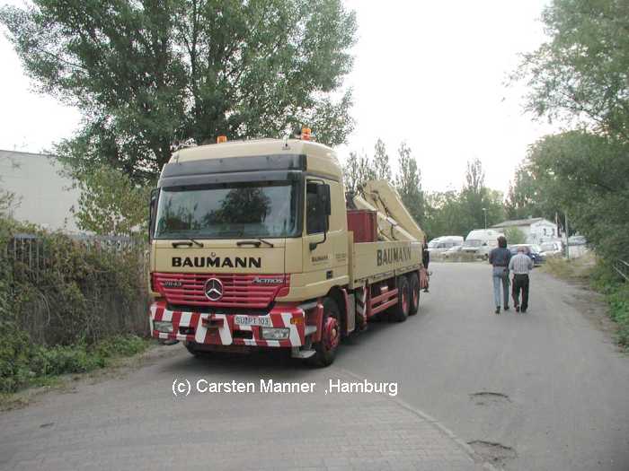Als Hilfsfahrzeug beim Transport diente dieser Pritschen Lkw mit Heckladekran