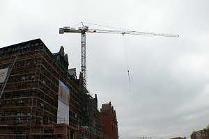 In der Shanghaiallee sollte ein Turmdrehkran auf der Baustelle an einem Kontorhaus versetzt werden.
