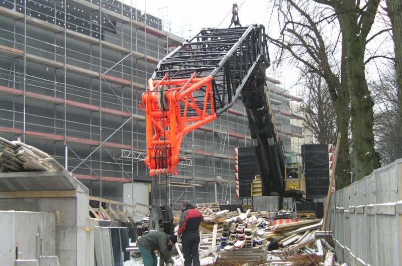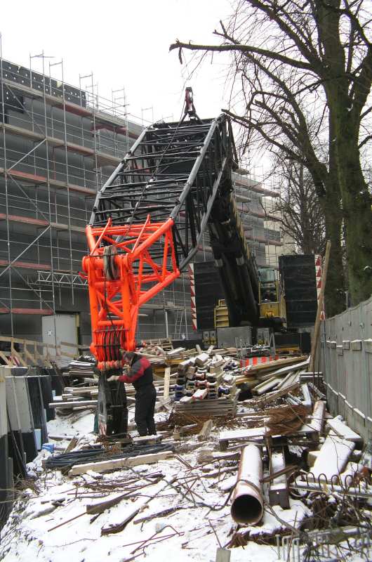 Der Kran wurde mit einer 14 m langen, 40 Grad abgewinkelten Gitterspitze aufgerüstet,