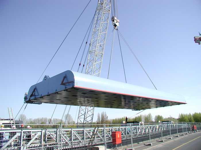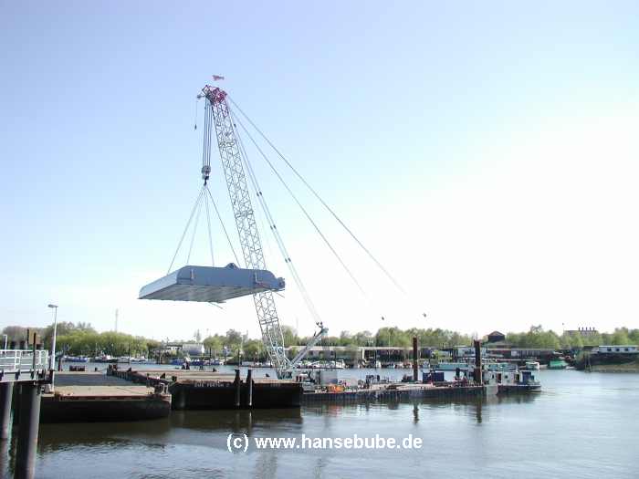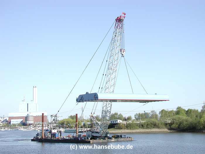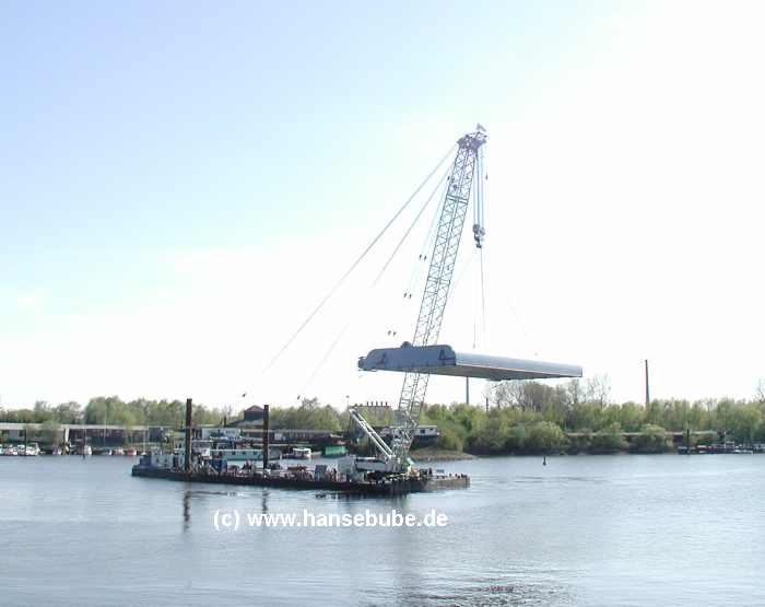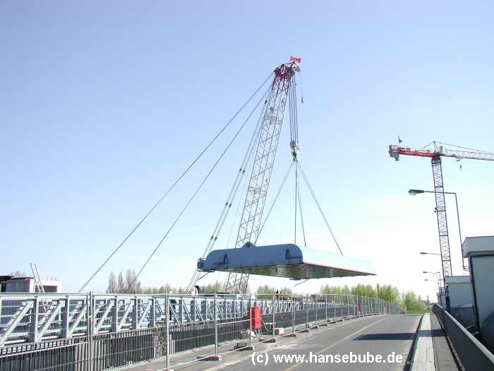 Der Kran ist am Sperrwerk angekommen , gut zu erkennen : Die beiden zusätzlichen Nackenseile,