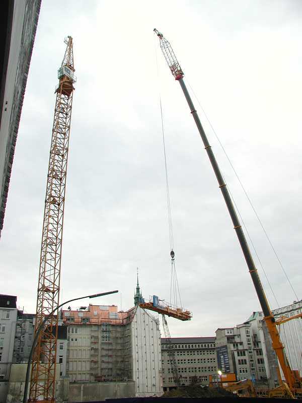Der Gegenausleger des Turmdrehkranes wird montiert