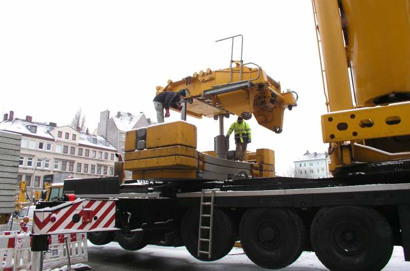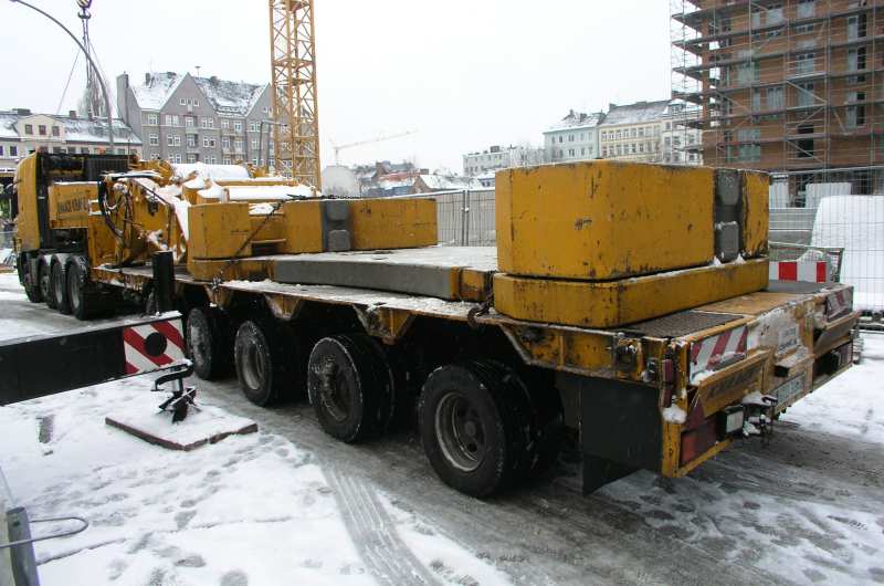 Hier sind bereits 30 t Ballast und der Windenrahmen auf einem 5achser Semi verladen, Zugmaschine ist Knaacks Actros Titan