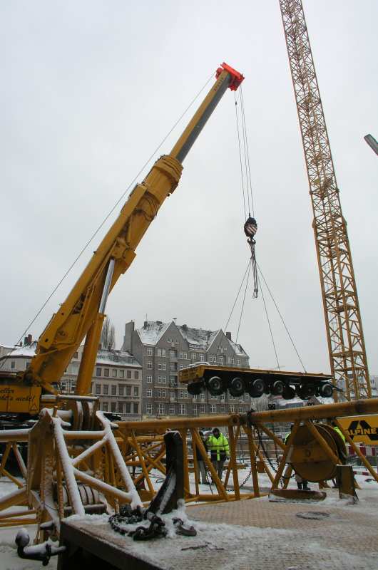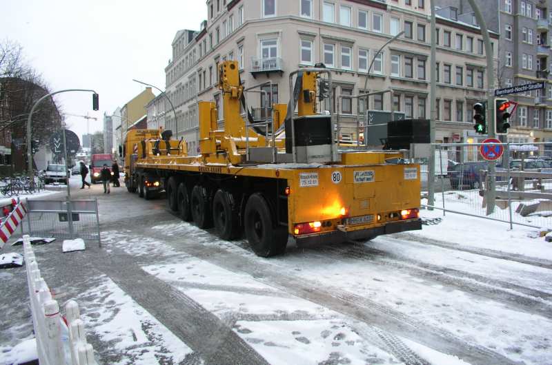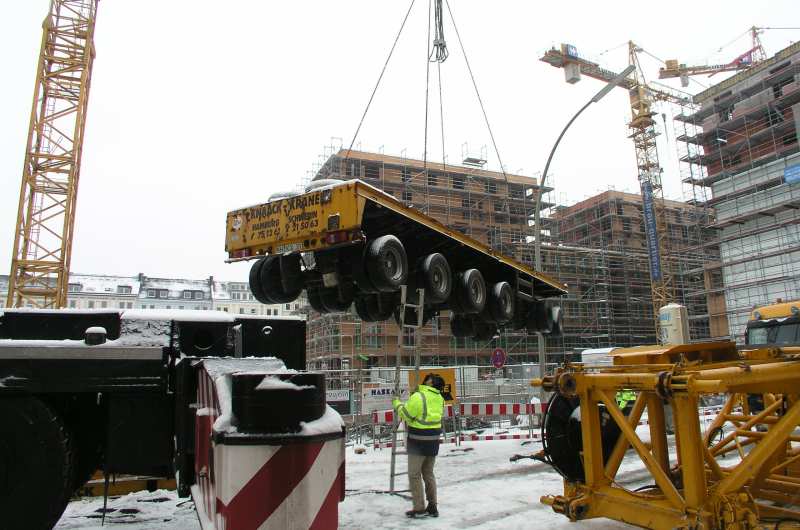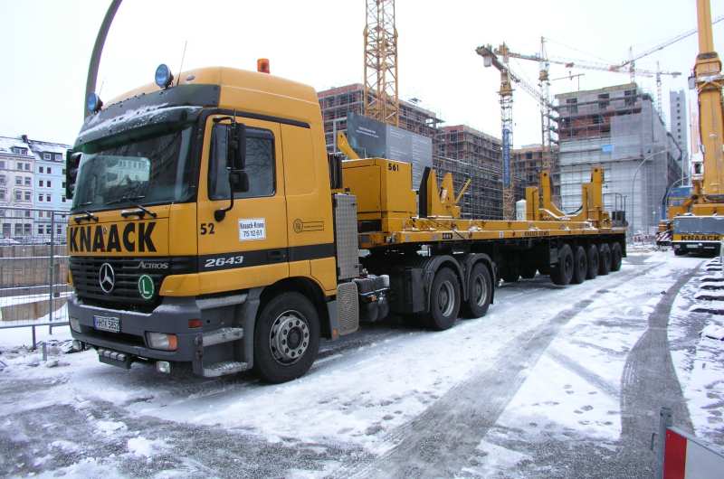 Der Transportzug für den Telemast. Der Aufbau ist eine abnehmbare Tranporteinrichtung von Liebherr