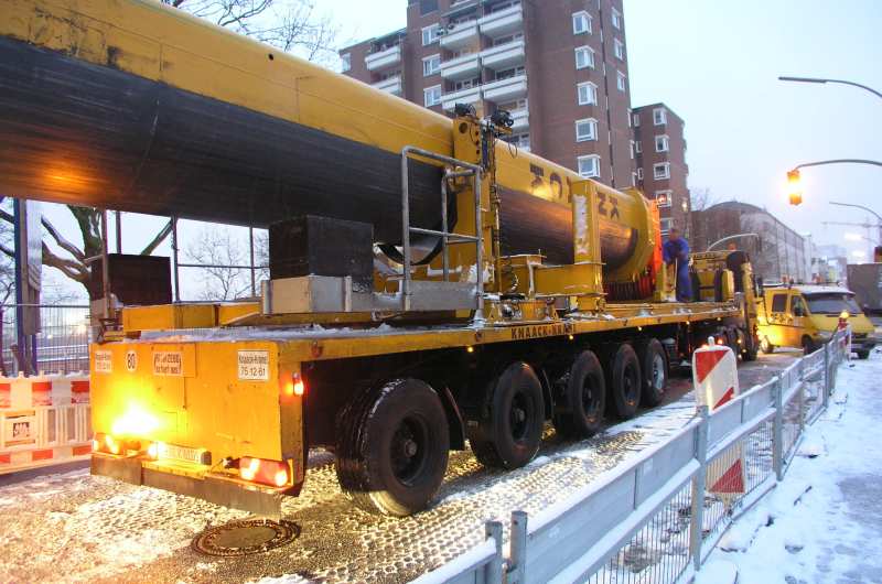 Der Rollenkopf wird in einen Führungsschlitten auf dem Tranportgestell abgelegt und verriegelt