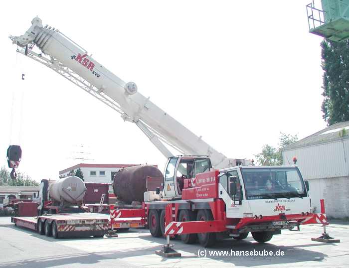 Es galt einen 13 t schweren Druckbehälter von einem Flatbedcontainer auf einen Tieflader der