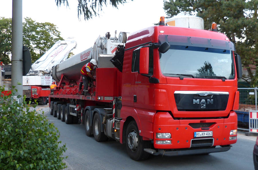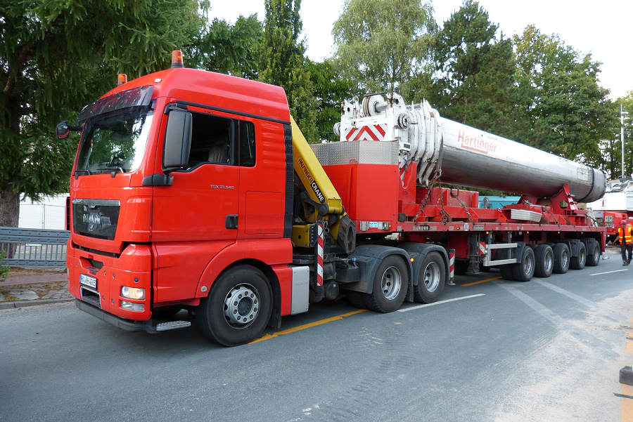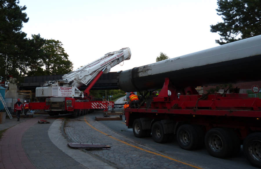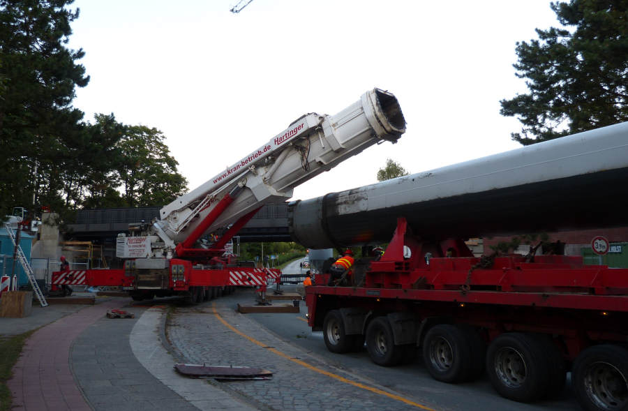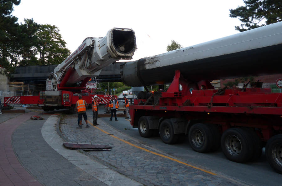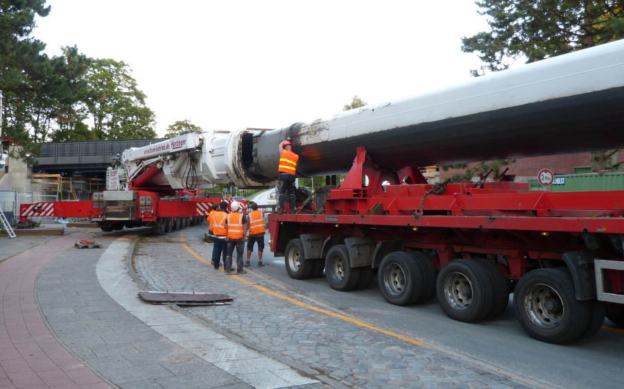 Während am Masttransporter die Ausschübe für den Transport gesichert werden,