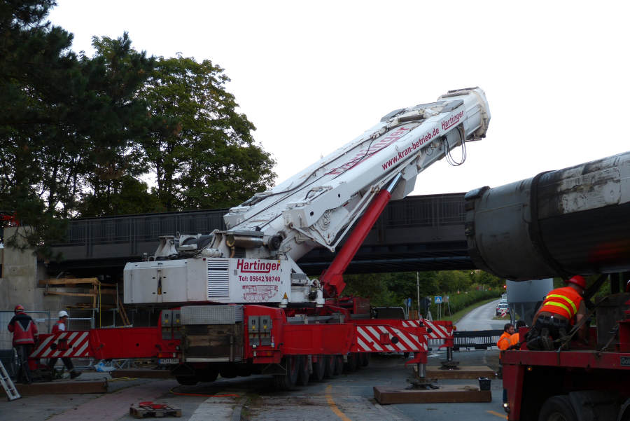 Nachdem rundum die Gleitlagerschalen ausgebaut worden und die Telemastverbolzungen auf der Oberseite gelöst worden sind,