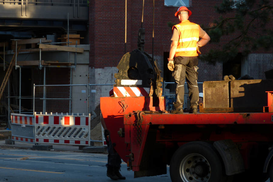 Nachdem der Auflieger an den Kran herangefahren ist, wird die Hakenflasche in der Tasche abgelegt und ausgeschert.