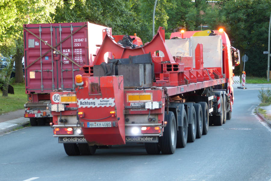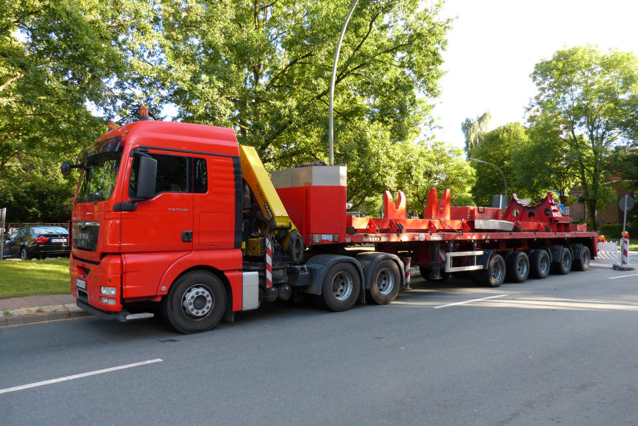 Bei Hatinger werden die Teleskopteile auf einem fünfachsigen Goldhofer Ballasttrailer, mit entsprechender