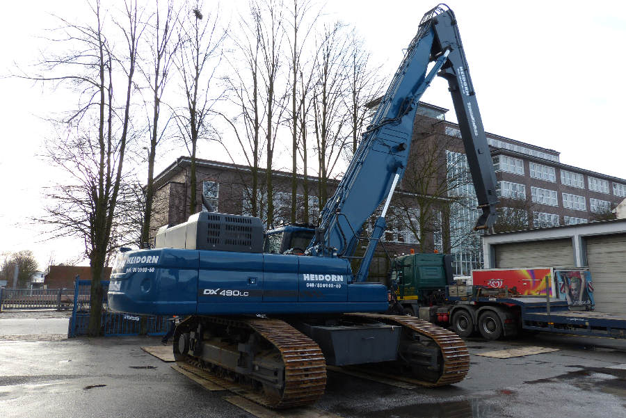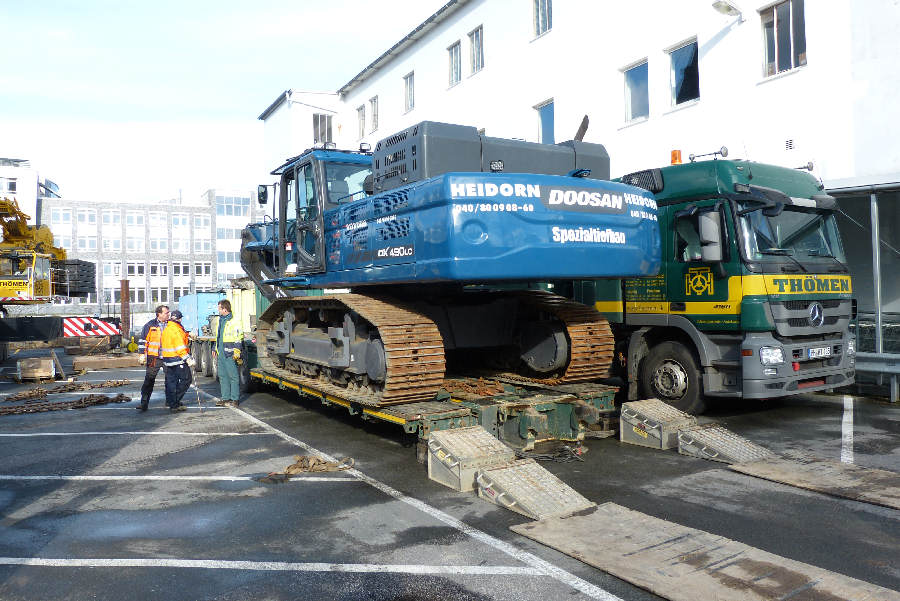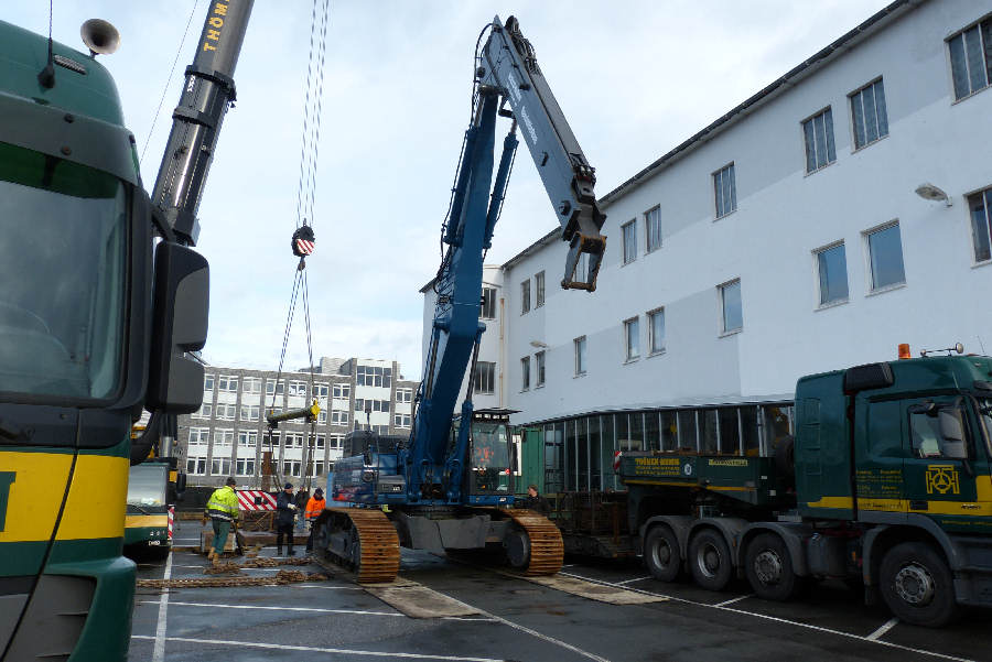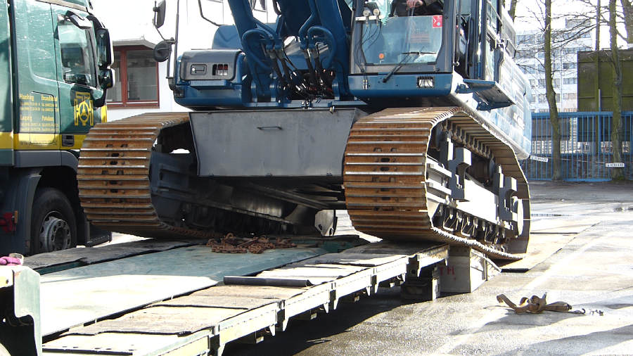 Umsetzen eines Hydraulikbaggers von einem Ponton an Land