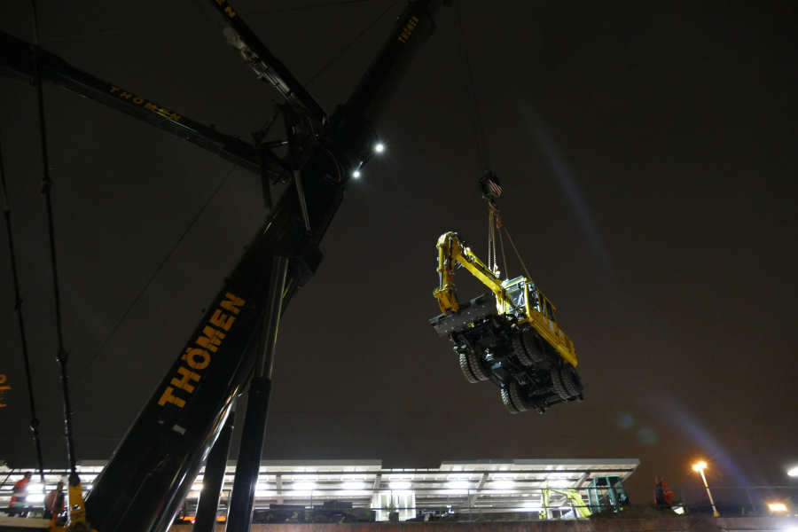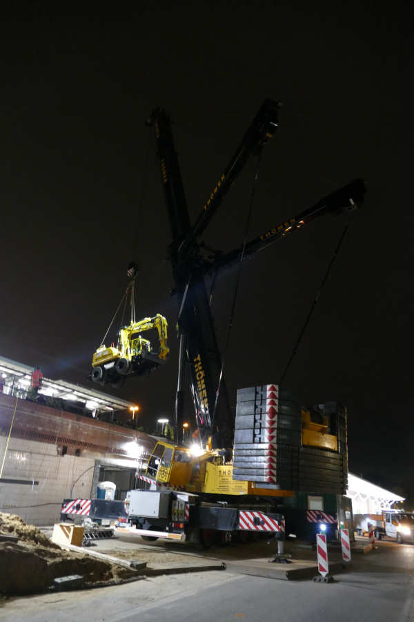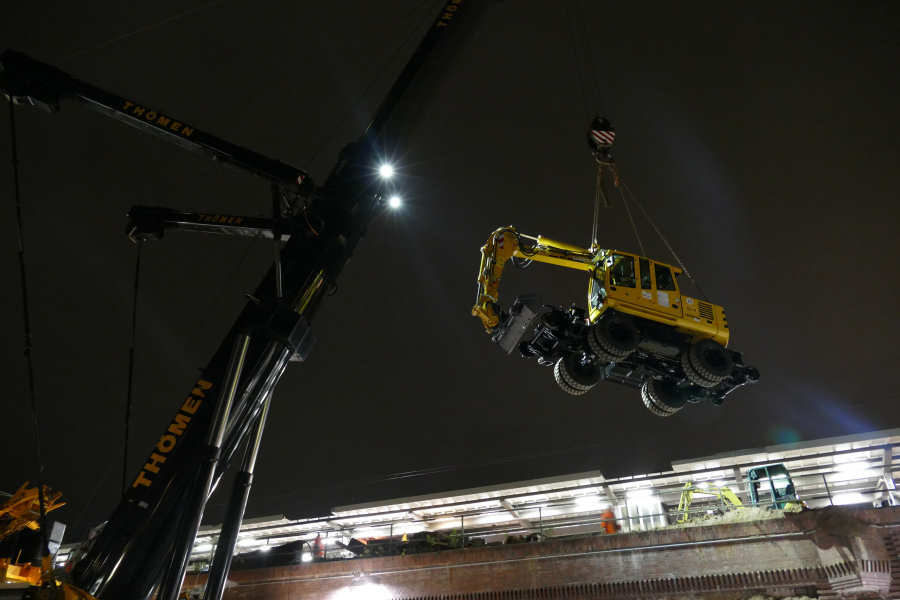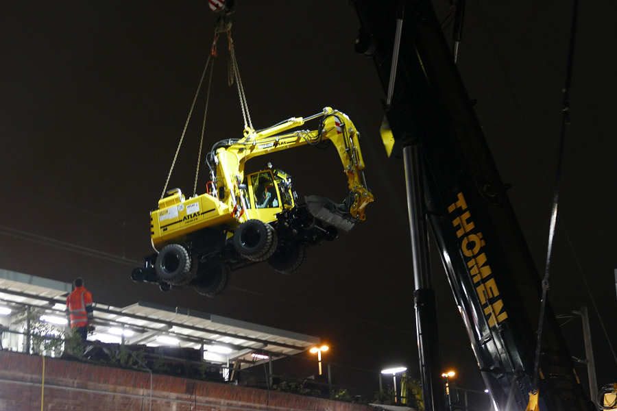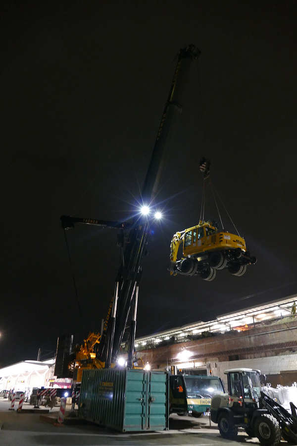 Hub eines Zweiwegebaggers auf eine Bahnbaustelle
