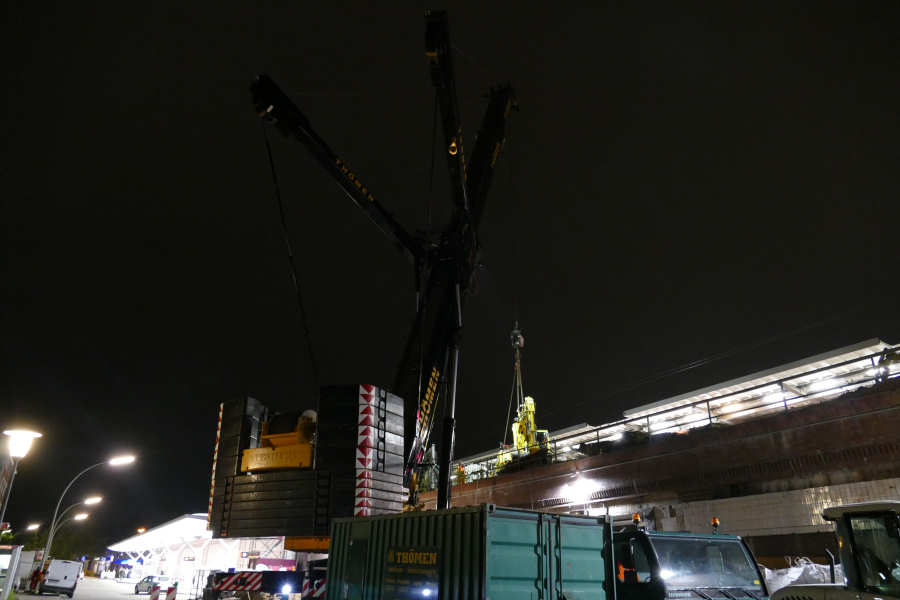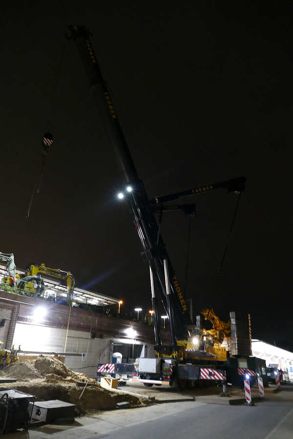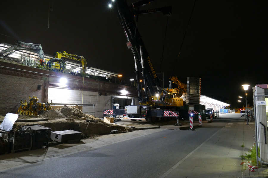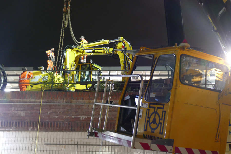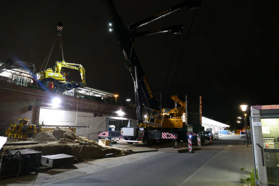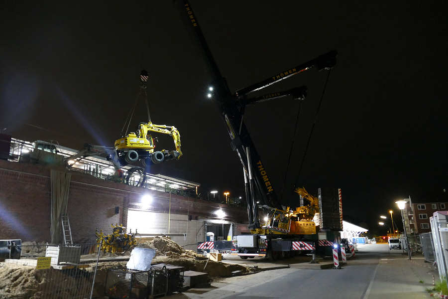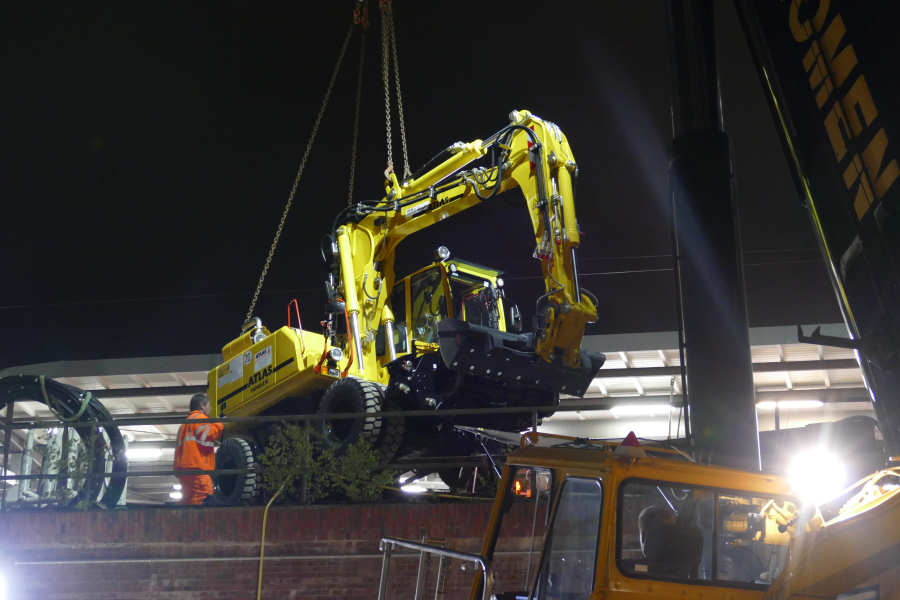 Hub eines Zweiwegebaggers auf eine Bahnbaustelle