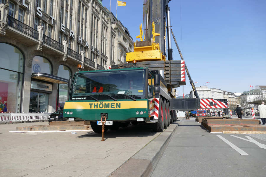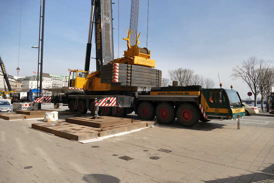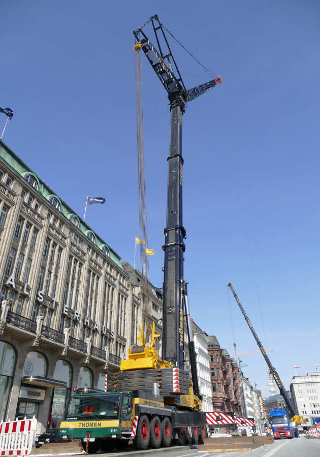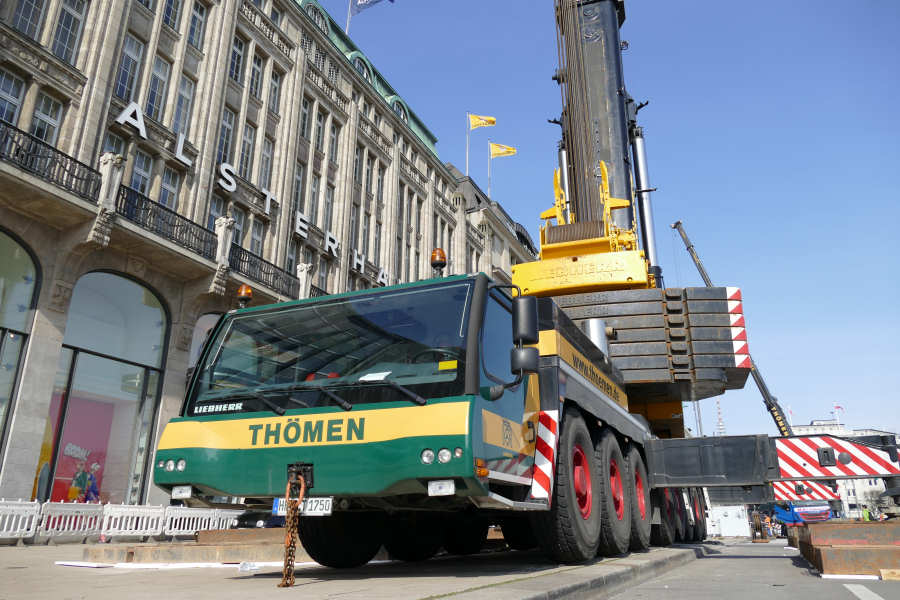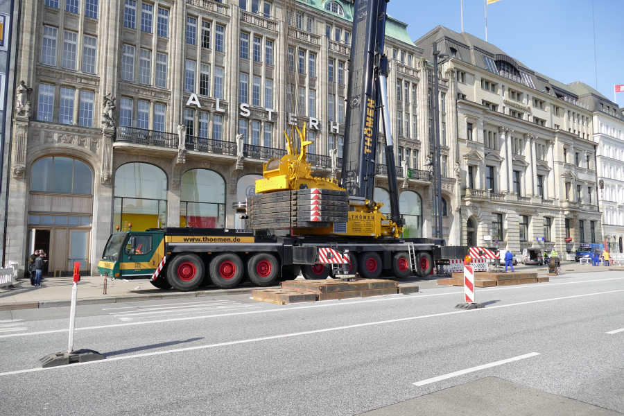 Im April 2015 wurden am Jungfernstieg, an der Binnenalster, in Hamburg Klimageräte auf dem Dach des Alsterhauses getauscht.