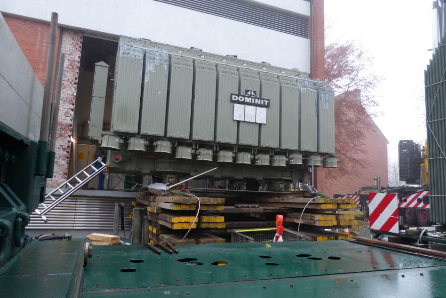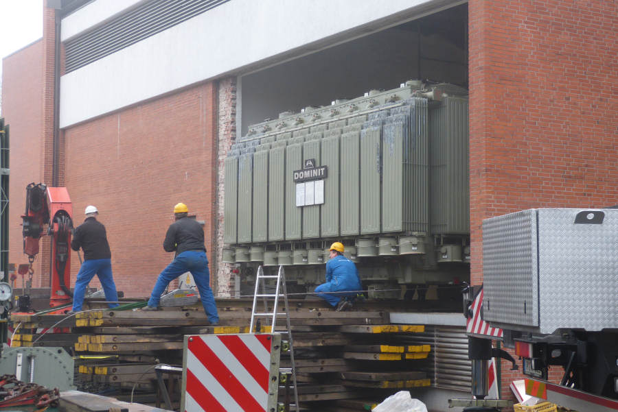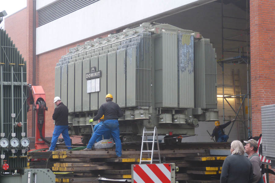 Herausziehen des Trafos, vor das Gebäude, als Stellfläche dienen aufgestapelte Bongossimatten, auf denen die