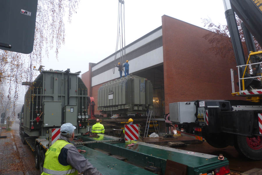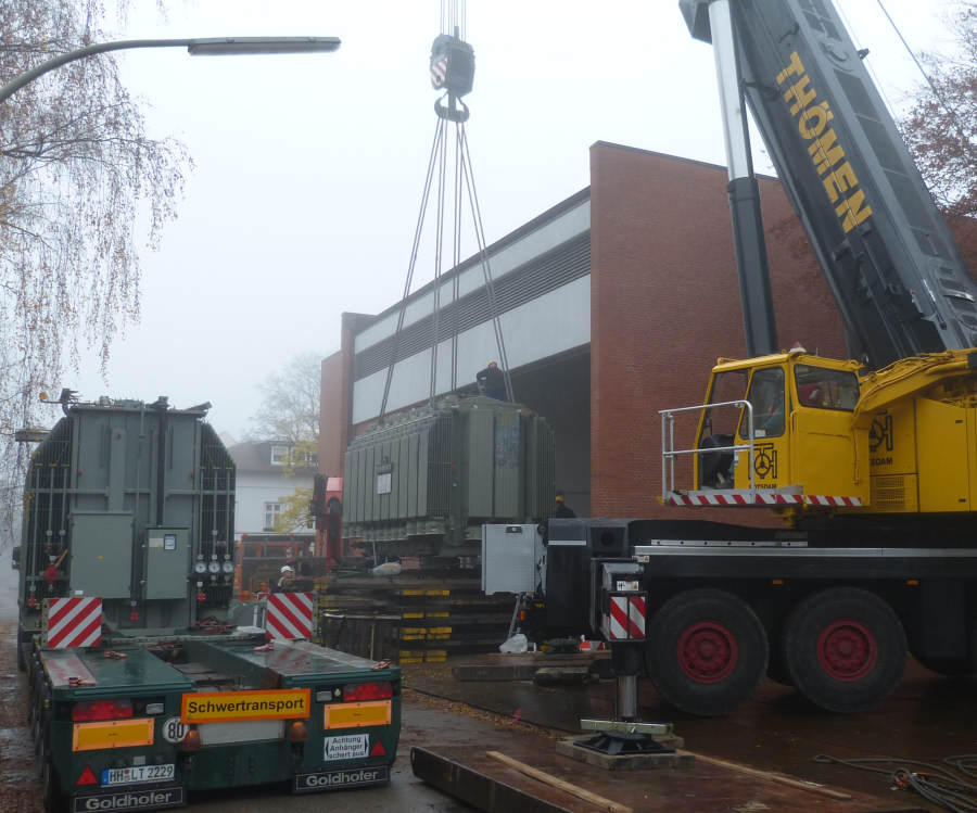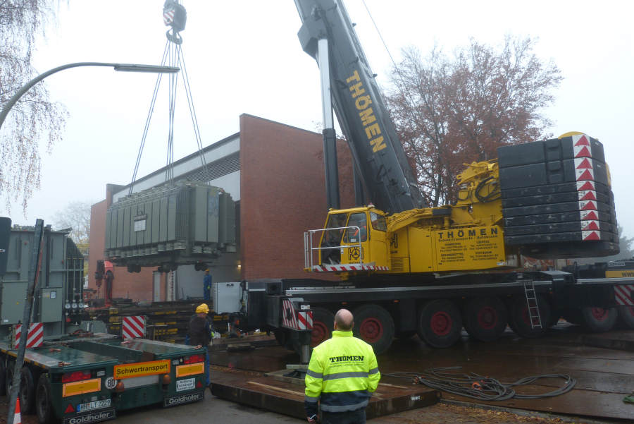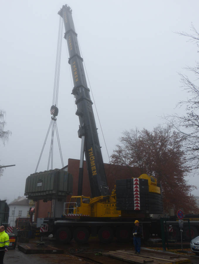 Der defekte Trafo wird mit dem Kran zunächst an der Straße abgestellt.