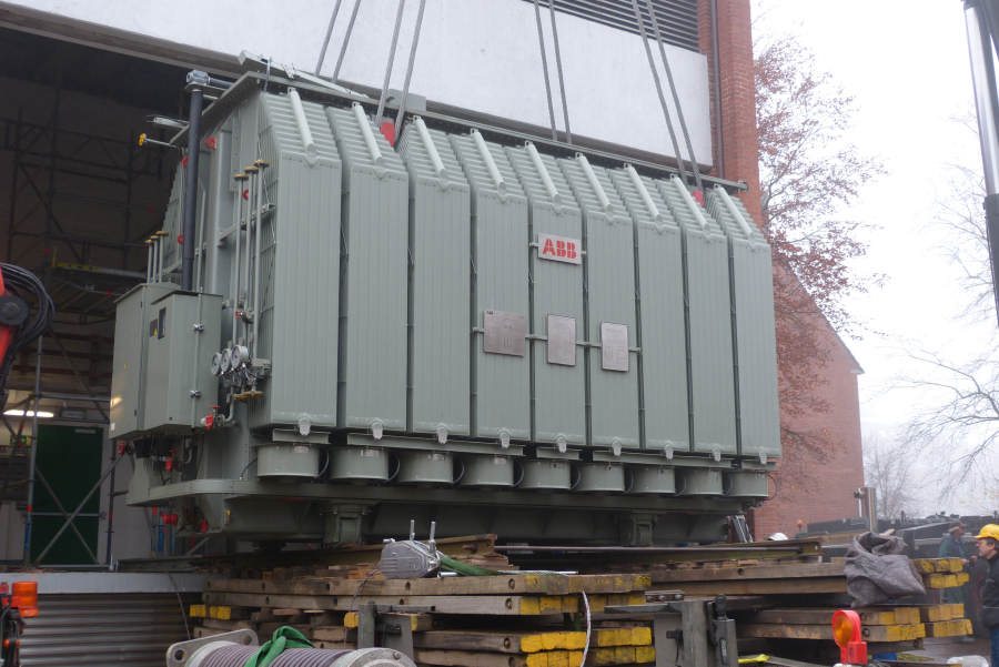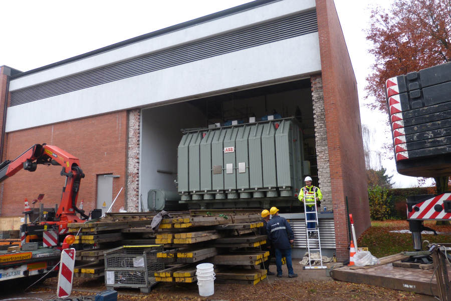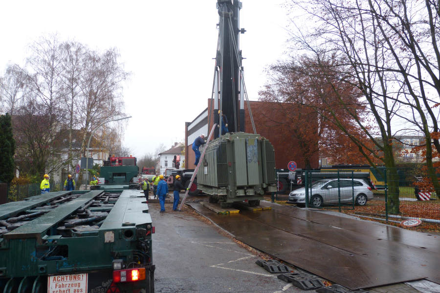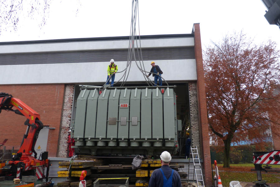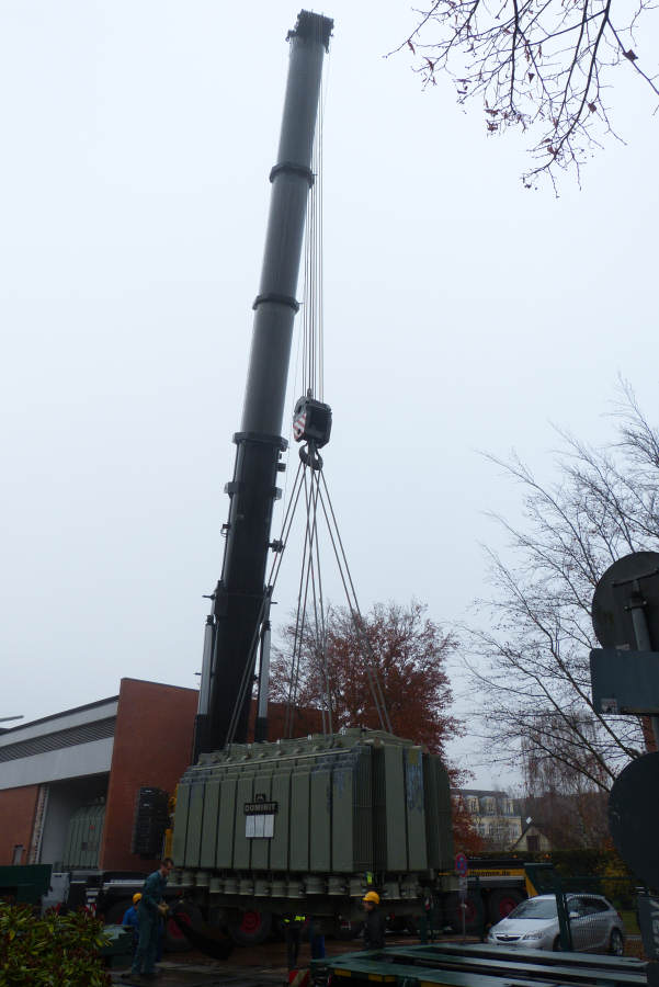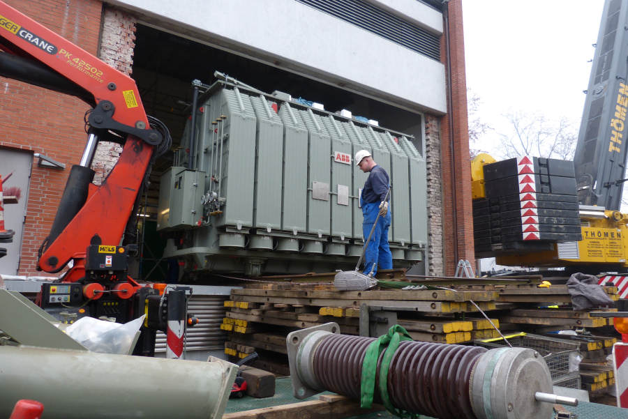 Nachdem der Trafo vom Kran abgeschlagen ist, wird er, wieder mittels Greifzug in die Trafonische gezogen.
