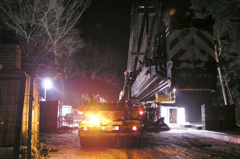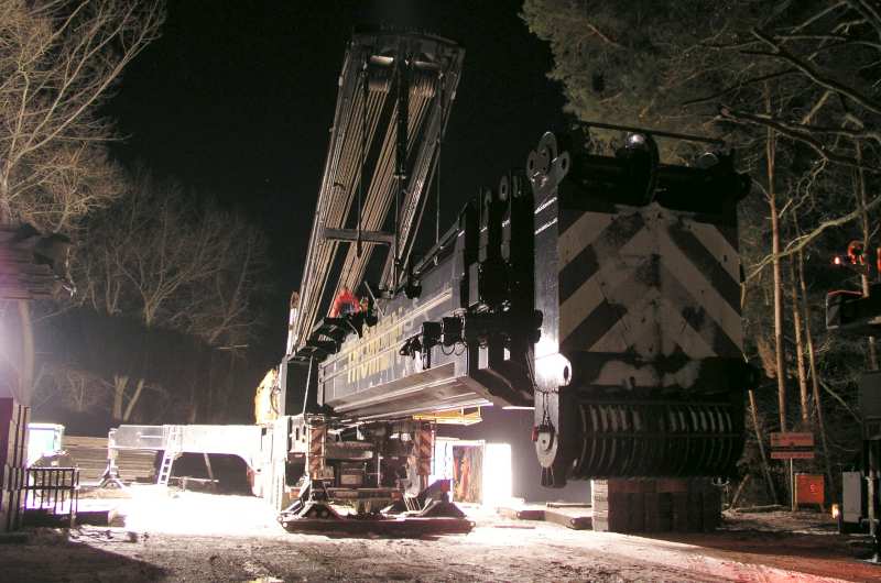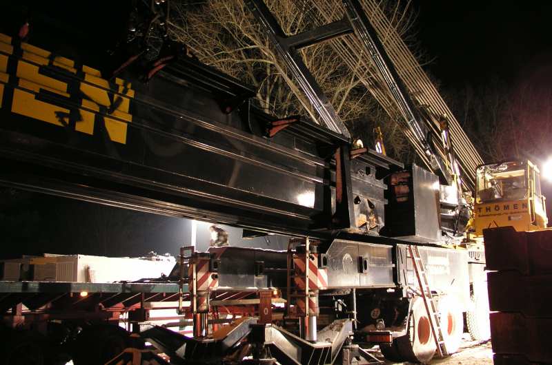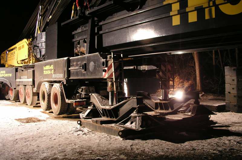 Interessant, beide hinteren Stützen übers Heck abgestützt, um den Masttransporter auf der engen Baustelle neben den Kran zu bekommen
