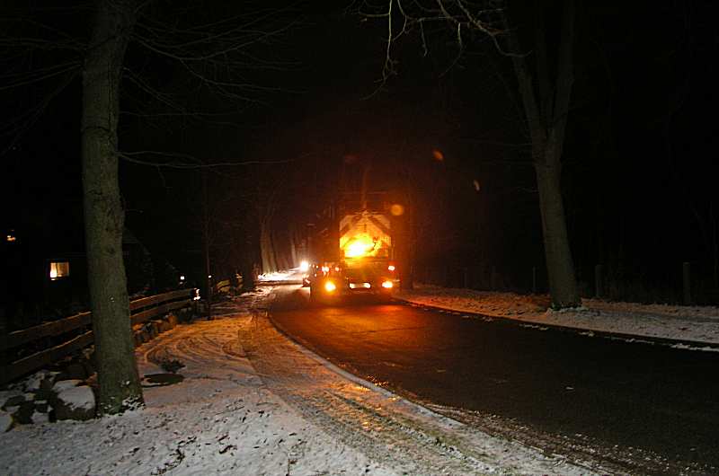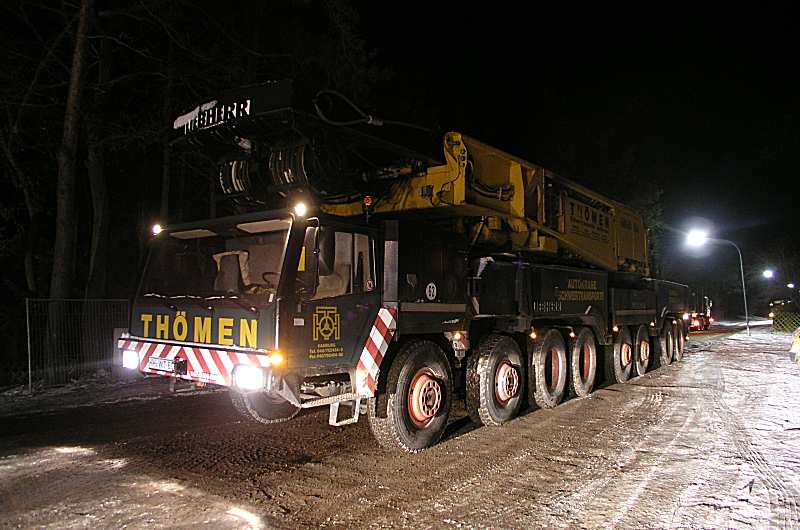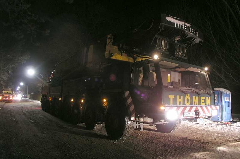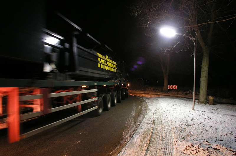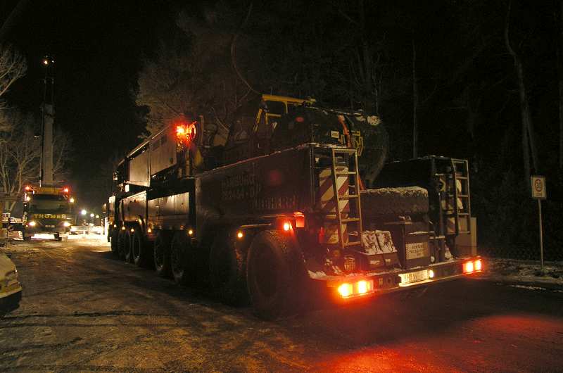 Währenddessen macht sich der Masttransport auf den langen Weg zur Strasse, rückwärts, wie geschrieben