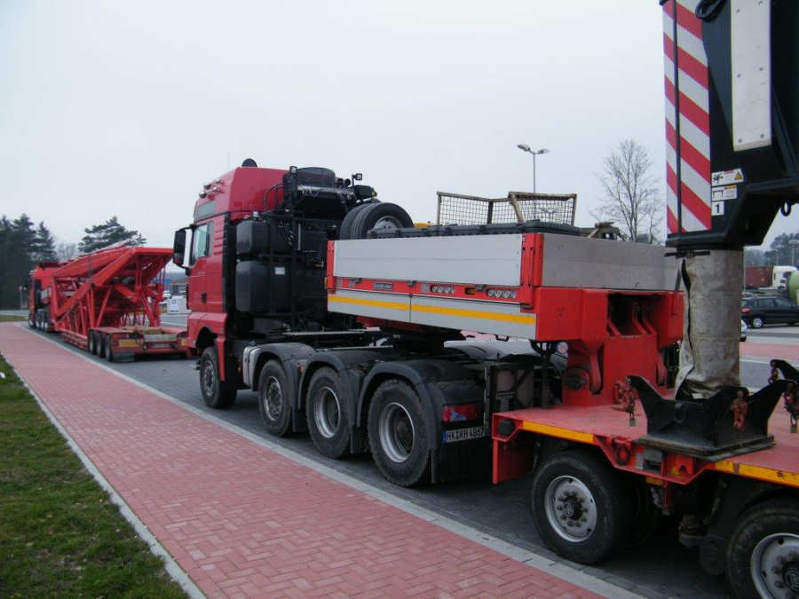Der Kran wurde Richtung Norden verlegt und die Transporte standen auf diversen Parkplätzen an der A 7.