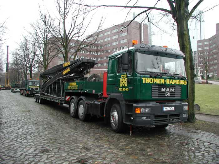 MAN mit Goldhoferauflieger beladen mit Wippenfußstück.