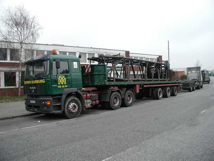 MAN mit Nooteboomteletrailer, beladen mit Abwinkelung der festen Gitterspitze mit montiertem
