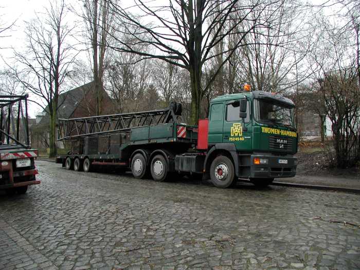 MAN mit Nooteboomauflieger, 30 t Ballast, Gitterboxen mit Anschlagmitteln und Kopfstück der Gitterspitze,