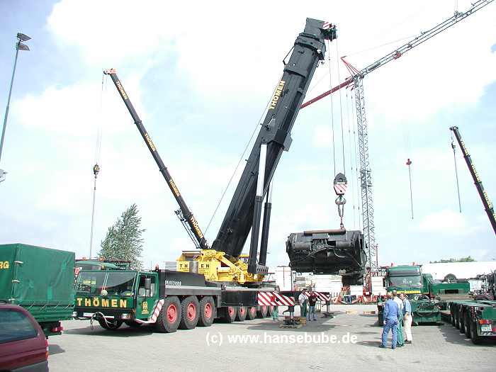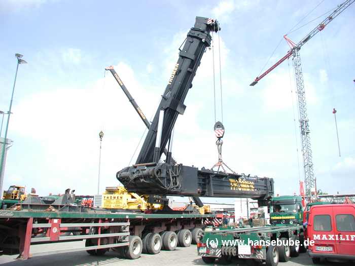 der 500 Tonner soll den Mast eines LTM 1800 vom Masttransporter abladen .