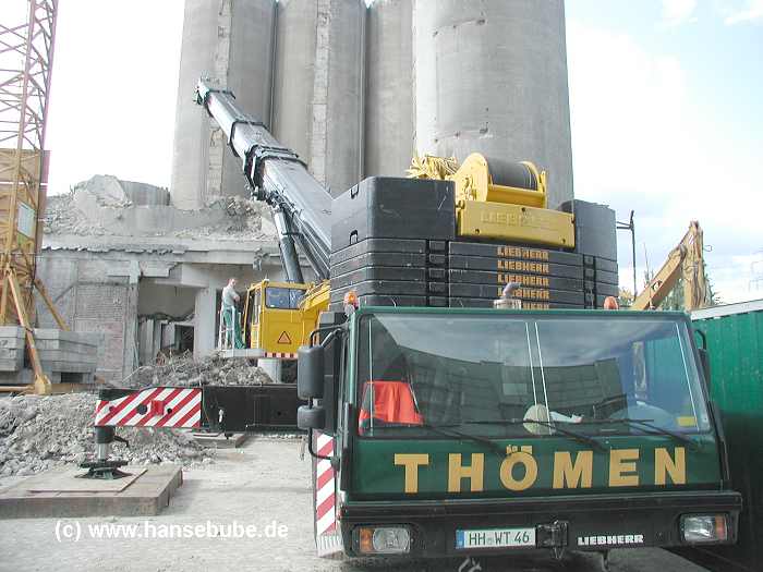 Einsatz auf einer Abbruchbaustelle , der LTM 1500 soll größere Trümmerteile ,