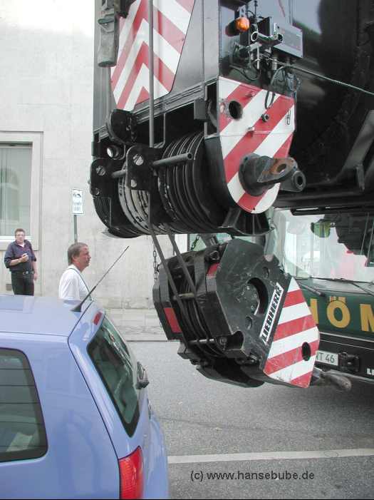 Die gewaltige Hakenflasche unmittelbar vor der Heckscheibe des Kleinwagens.