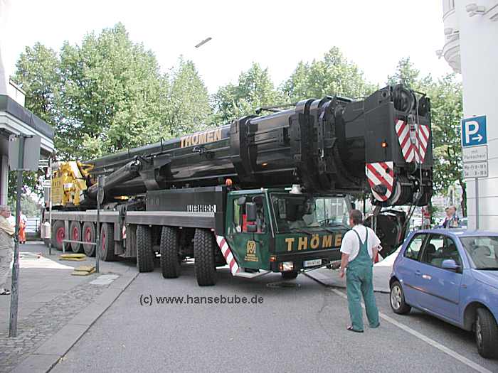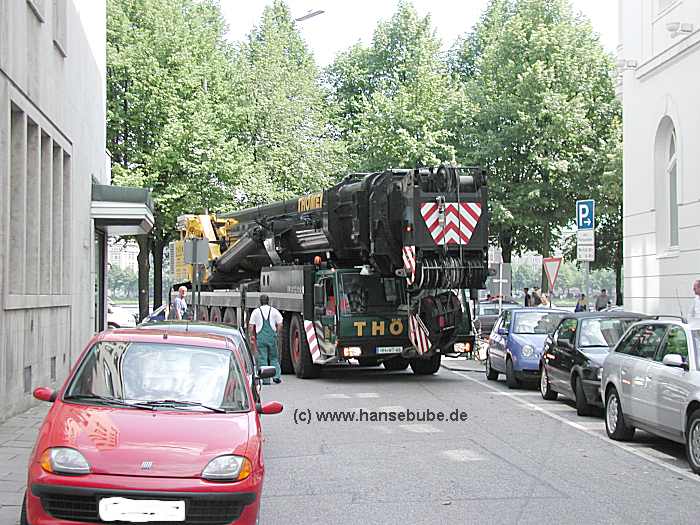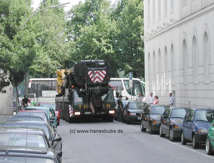 Geschafft der Kran steht in der Straße , nun gehts nur noch 200 m geradeaus .