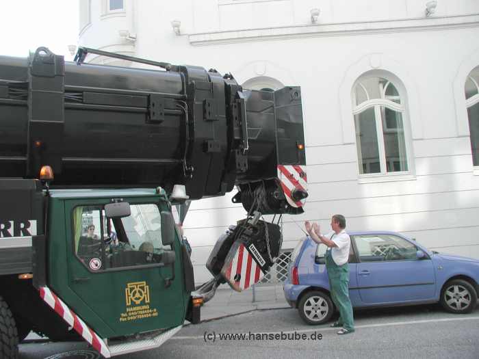 Doch noch steht der Kran nicht gerade in der Zufahrt,langsam tastet sich der Fahrer mit Hilfe eines Kollegens