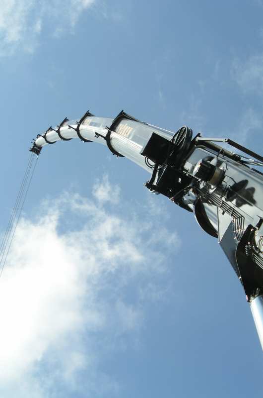 Die Durchbiegung des Teleauslegers unter Last ist enorm, aber vollkommen normal.