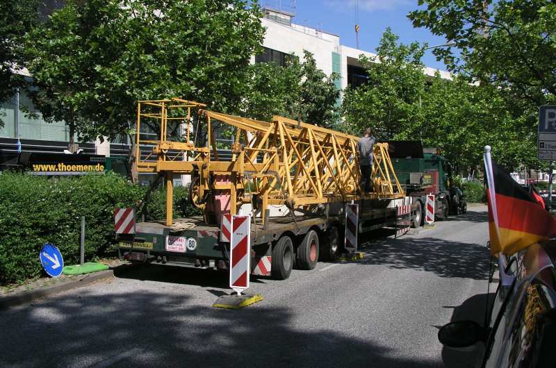 Der erste Transport mit Baukranteilen ist fertig beladen, der Kran sollte auf eine Baustelle nach Dänemark gebracht werden.