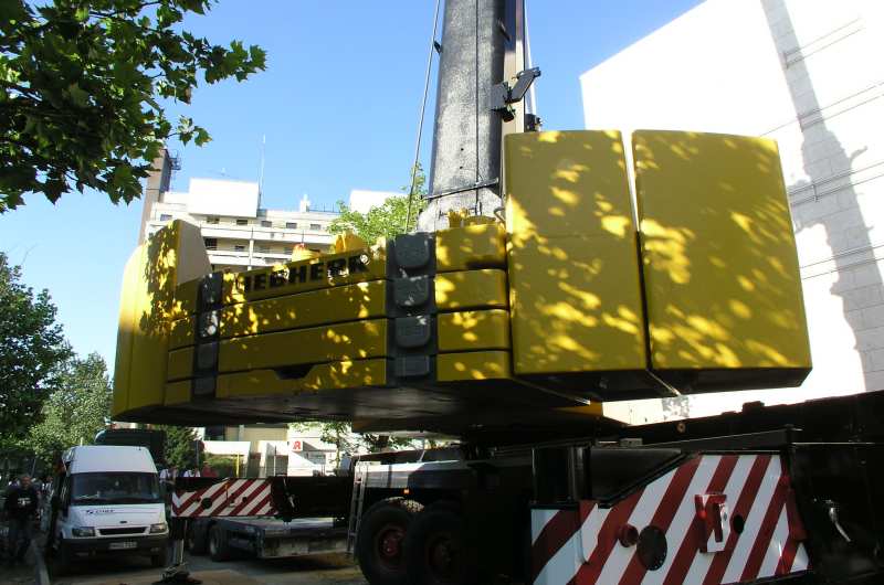 gefordert. Maximal 10,5 t bei  rund 30 m Ausladung waren zu ziehen, hierfür war der Kran mit 97,5 t Ballast aufgebaut worden.