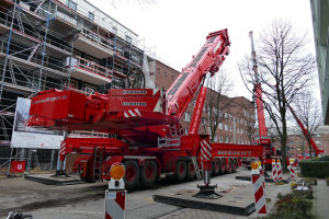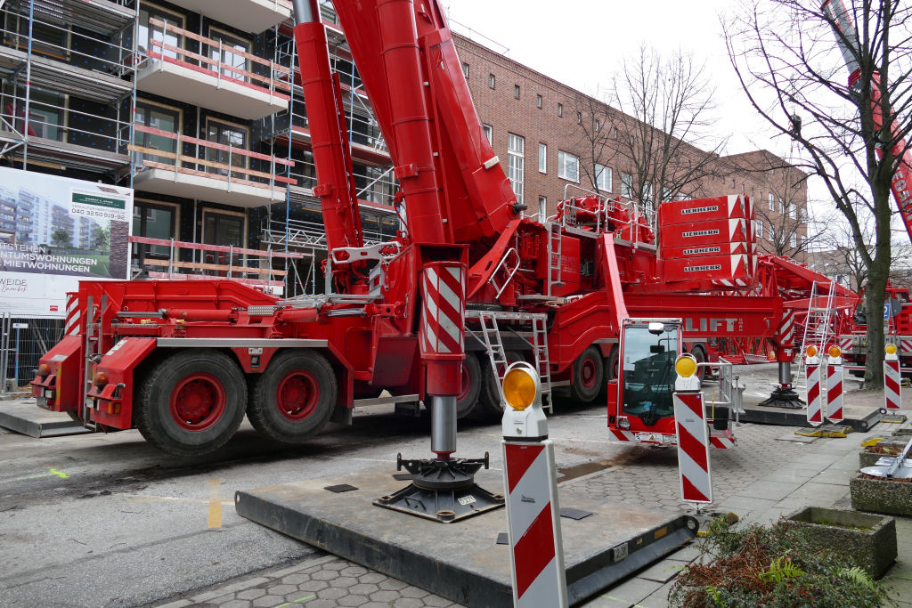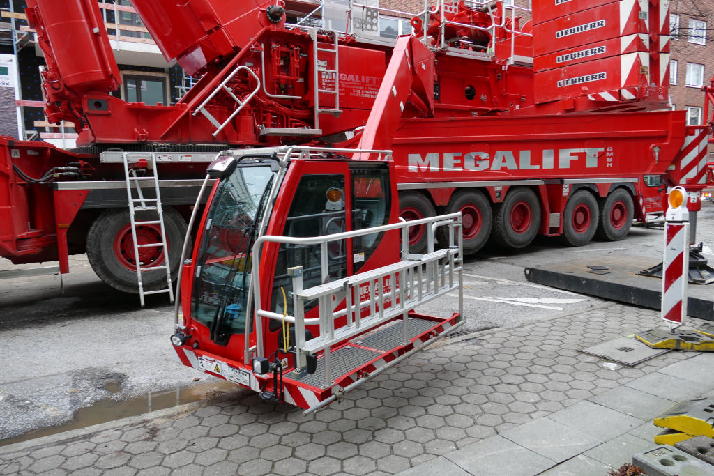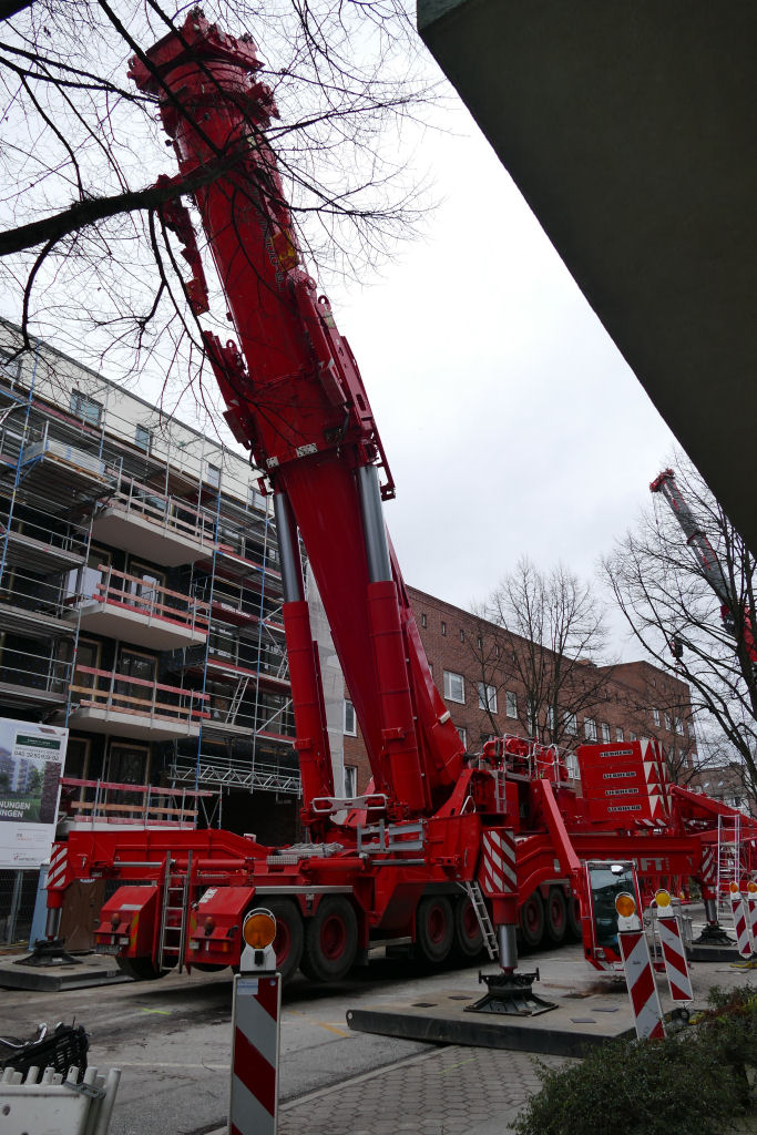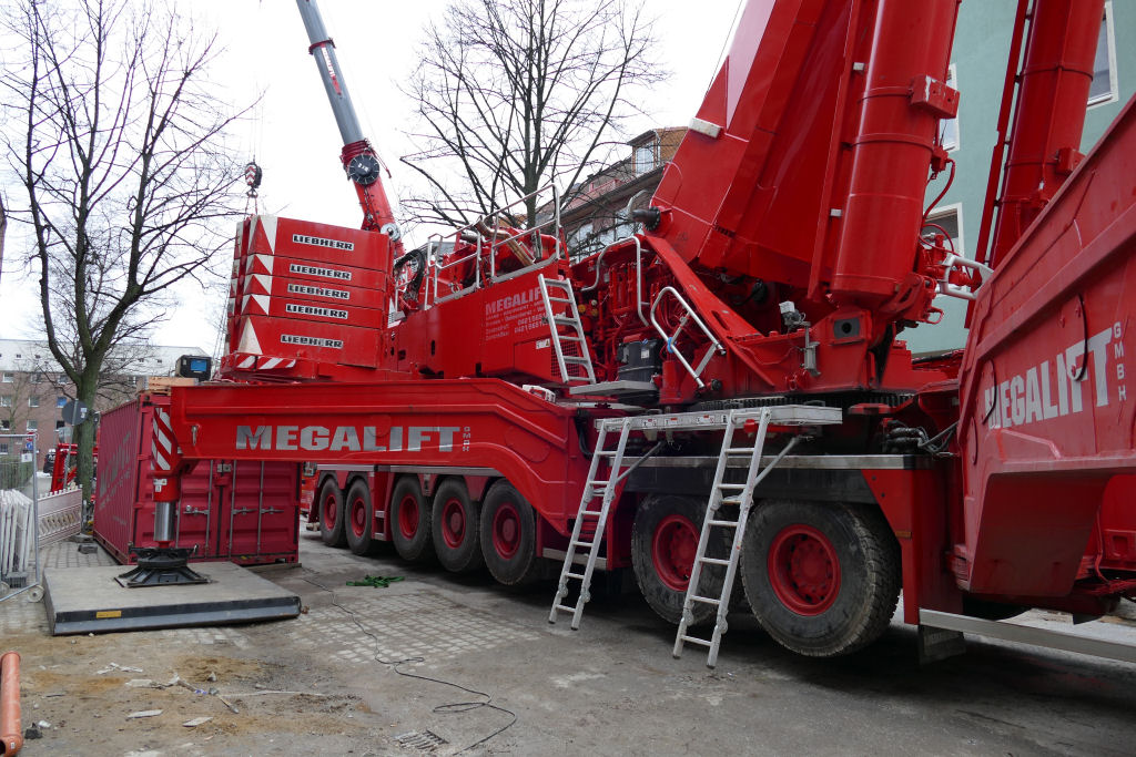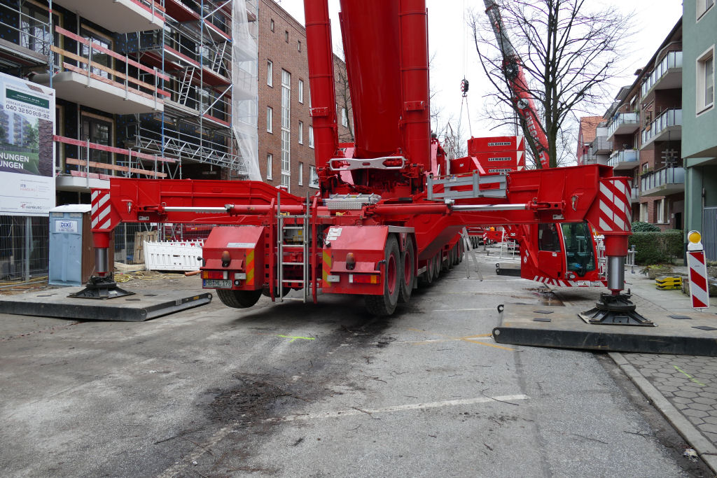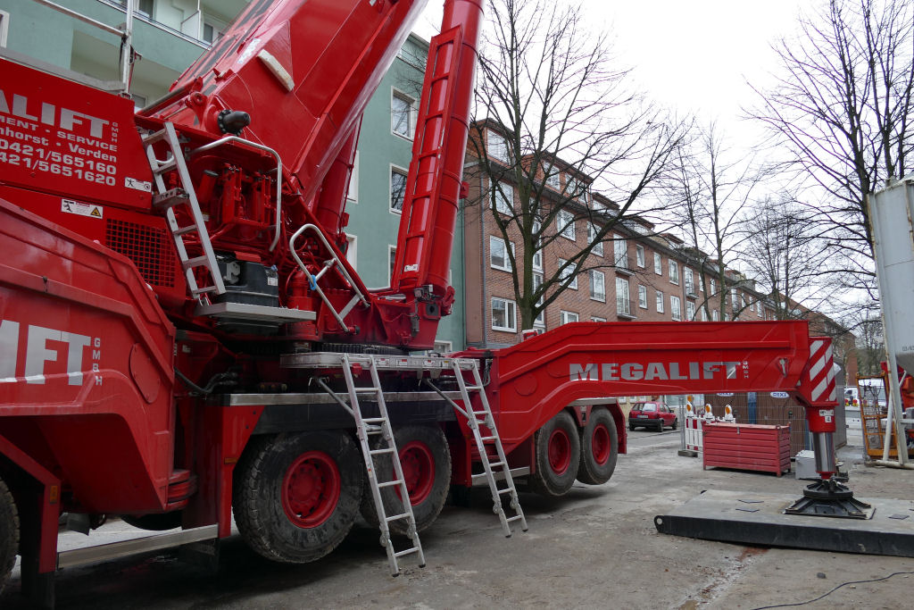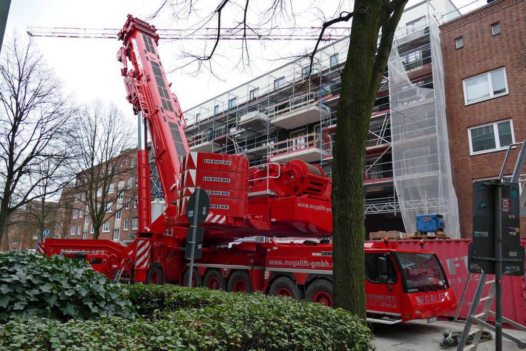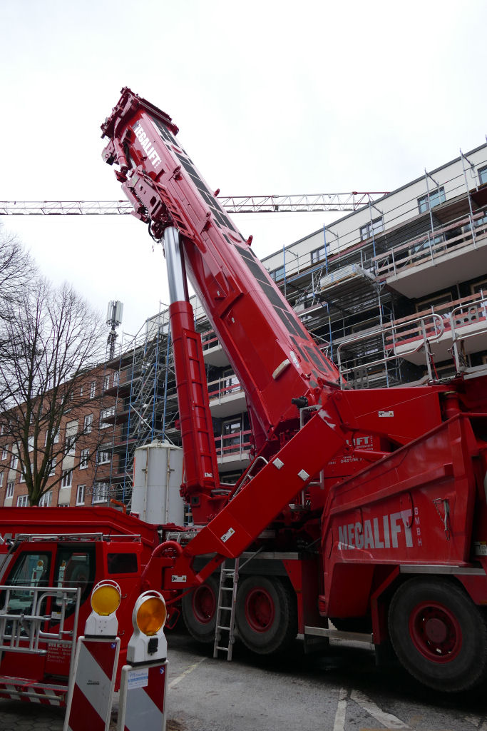 Megalift war mit dem LTM 11200-9.1 Ende Januar 2020 nach Hamburg Barmbek gekommen, um einen Baukran im Innenhof einer Baustelle