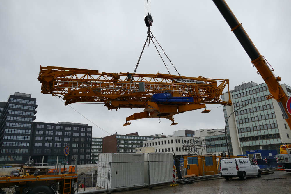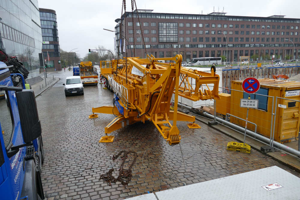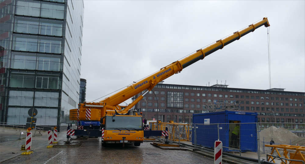 Schnellbaukran in eine Baugrube am Heidenkamps weg einzuheben.