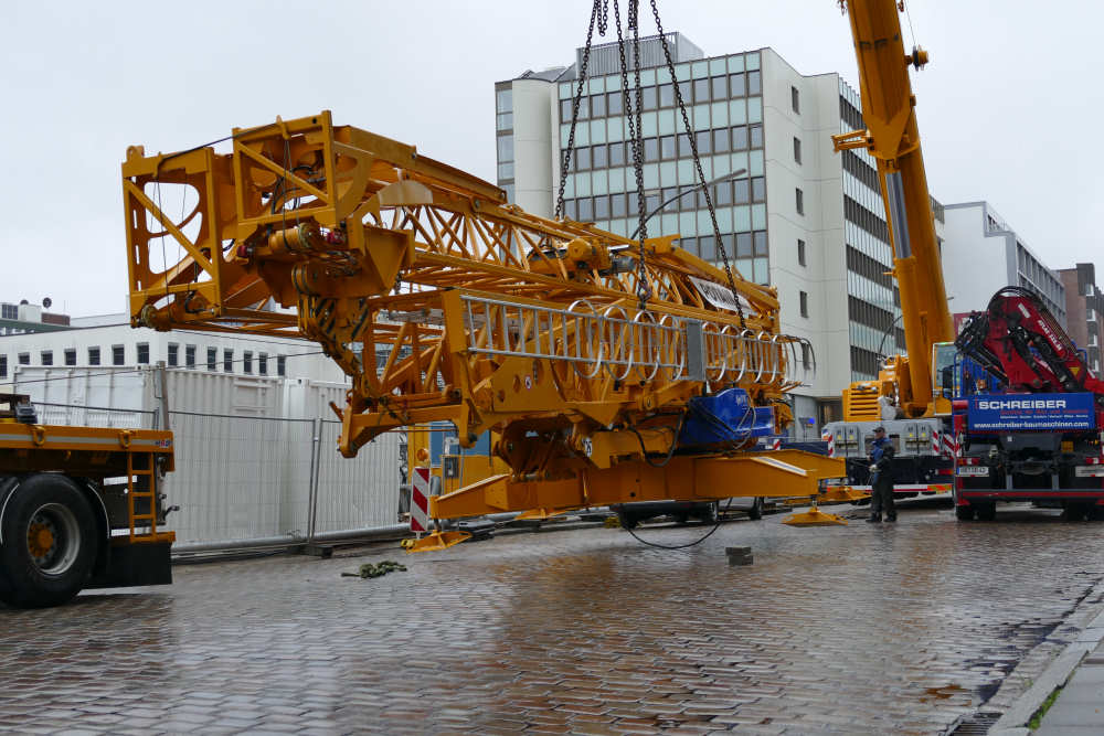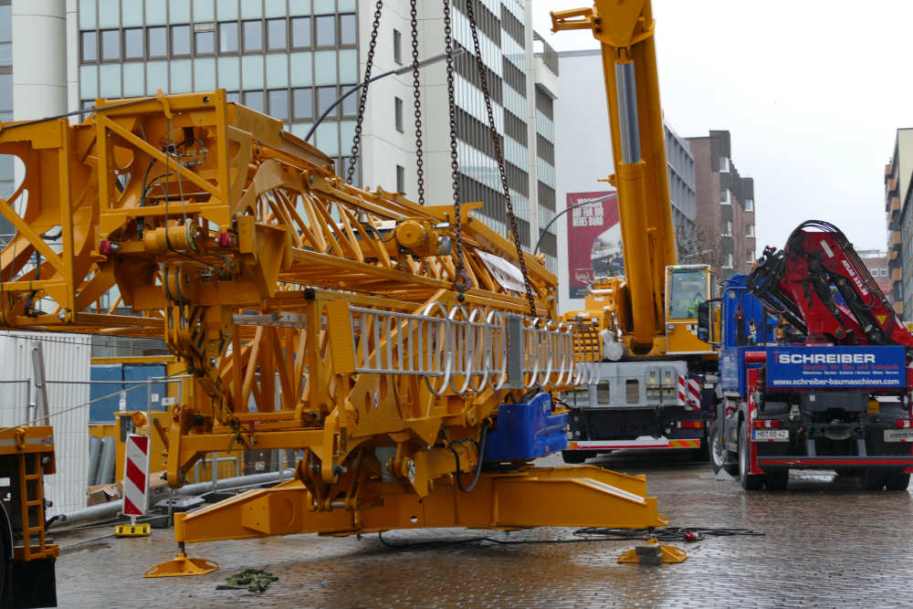 Der Baukran sollte vom Telekran heruntergelassen und aufgerüstet werden.