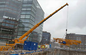 Einheben eines Potain IGO T 85 Schnellbaukranes in eine Baugrube |