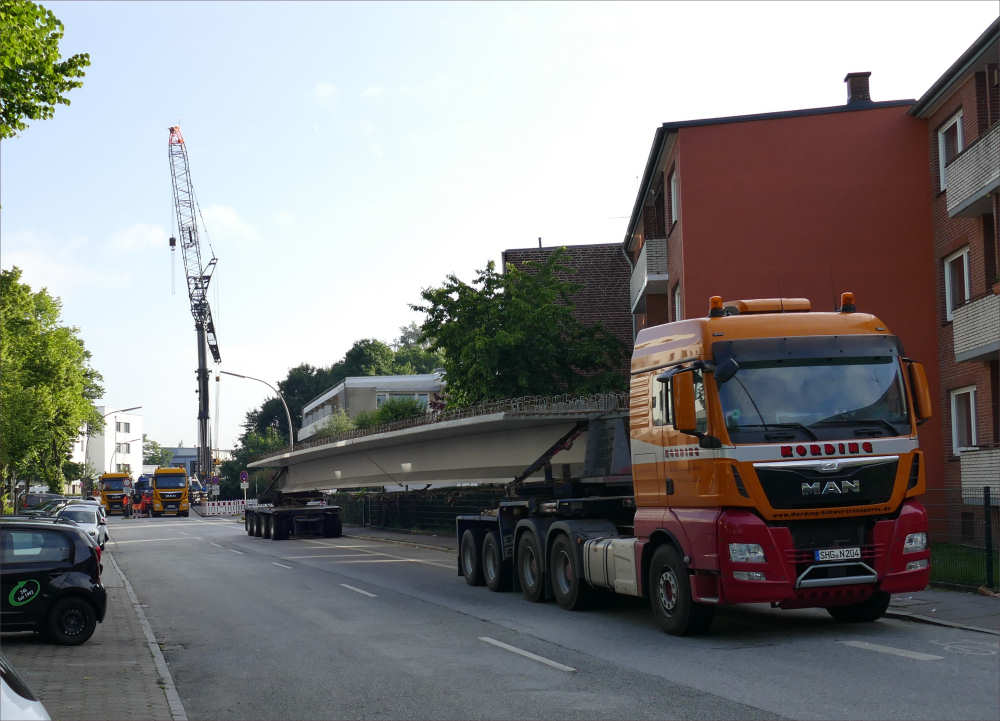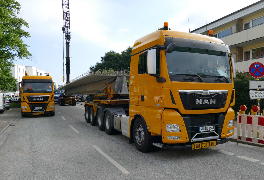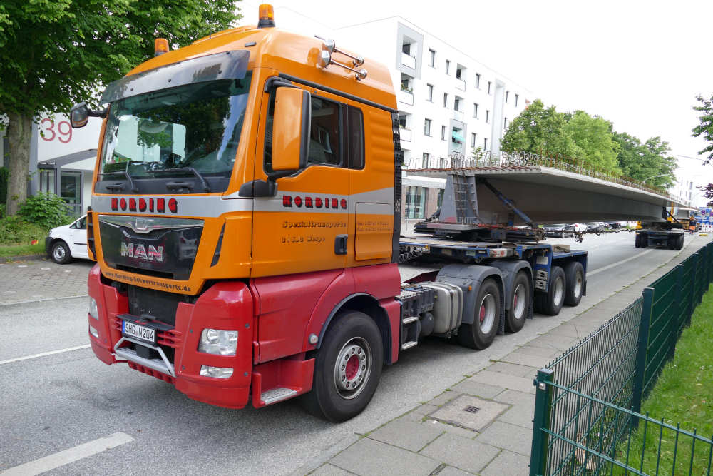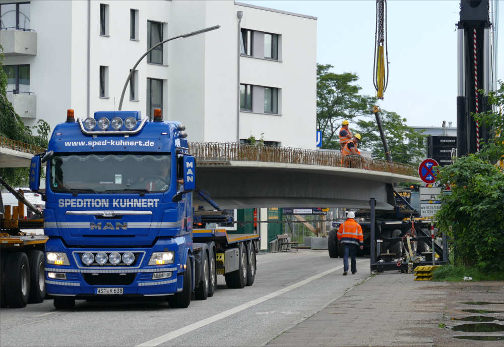 Im Juni wurden die Brückenbinder für die neue Brücke geliefert und montiert.