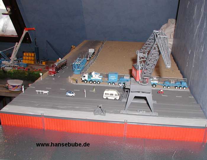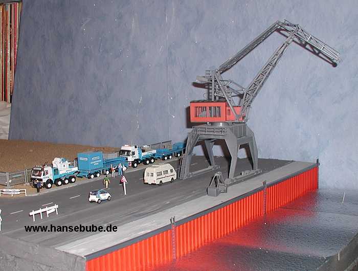 Am rechten Anlagenrand befindet sich eine Kaianlage mit Hafenkran an der zu früheren Zeiten viel Stückgut