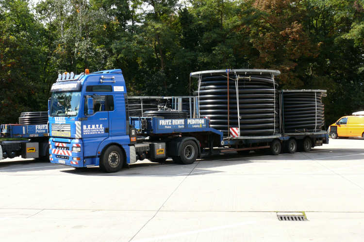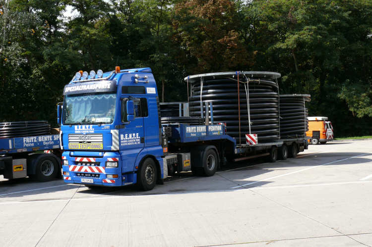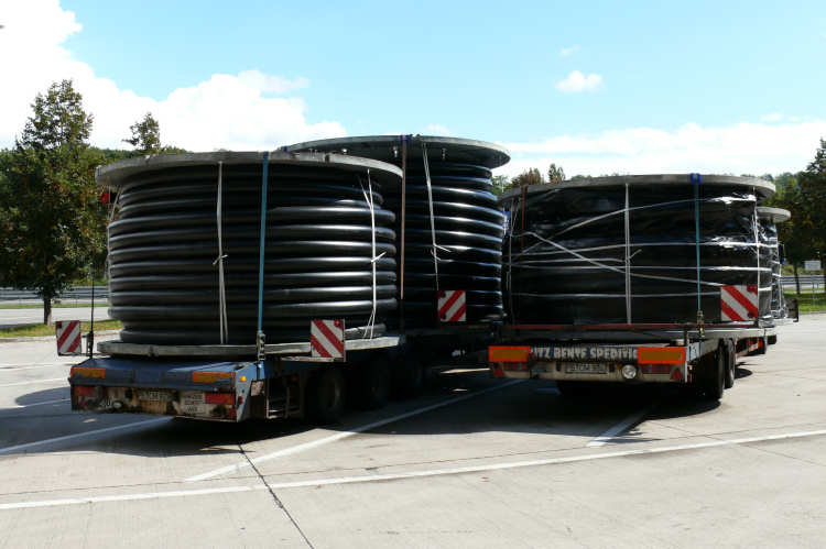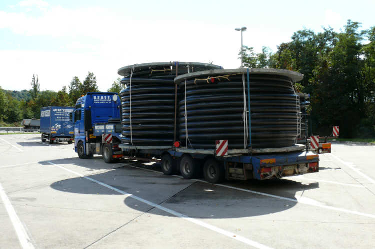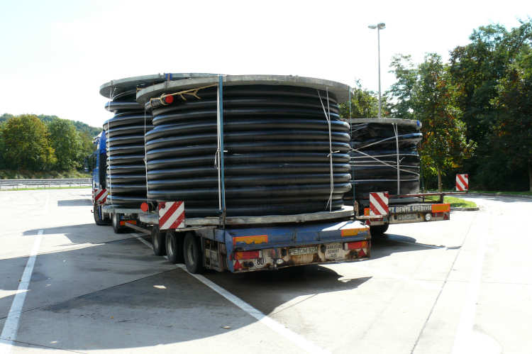 Süden unterwegs. Ladung: Übergroße Spulen mit flexiblen Kunststoffrohren.