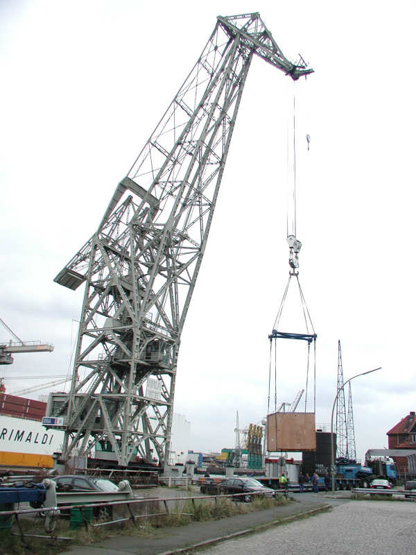Im April 2007 wurden zwei große Überseekisten mit Maschinenteilen, aus Korea kommend, mittels Schwimmkranen