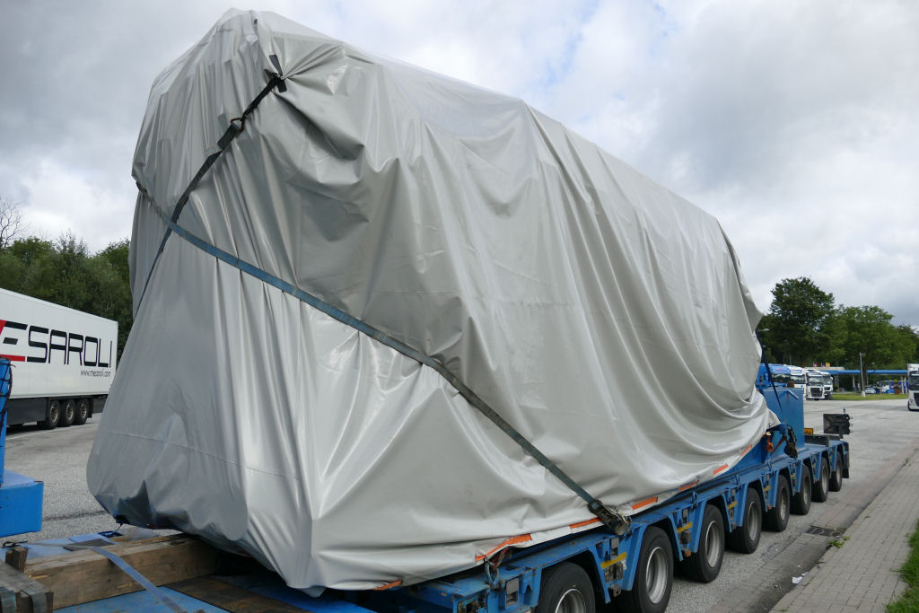 Transportiert wurde ein Getriebeteil unter Plane auf einem achtachsigen Goldhofer MP A 8 Semitieflader.