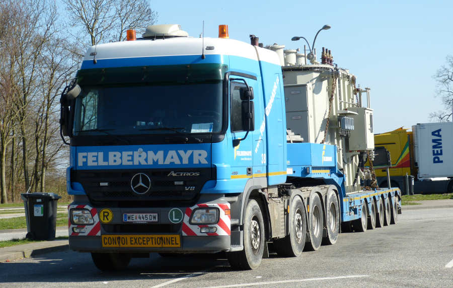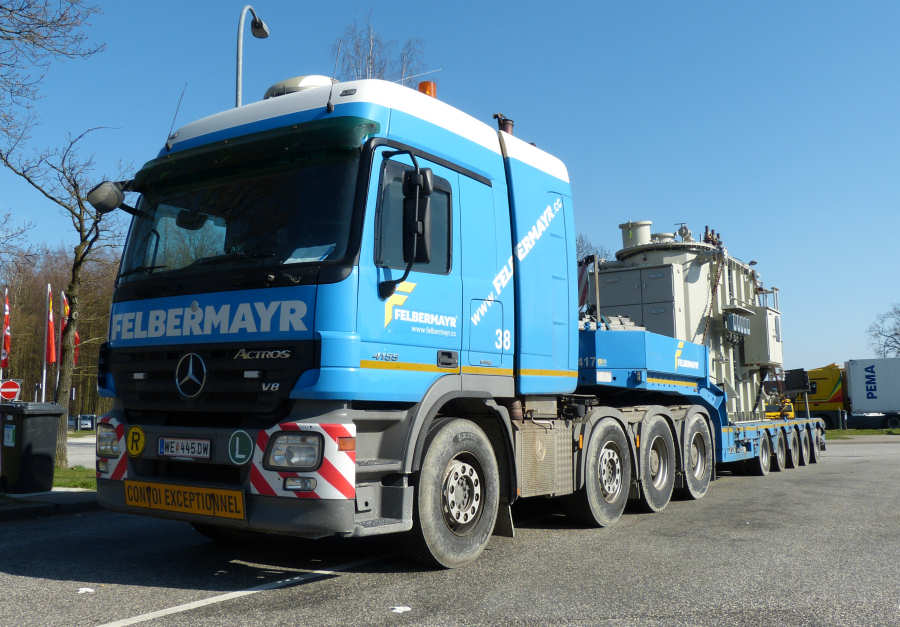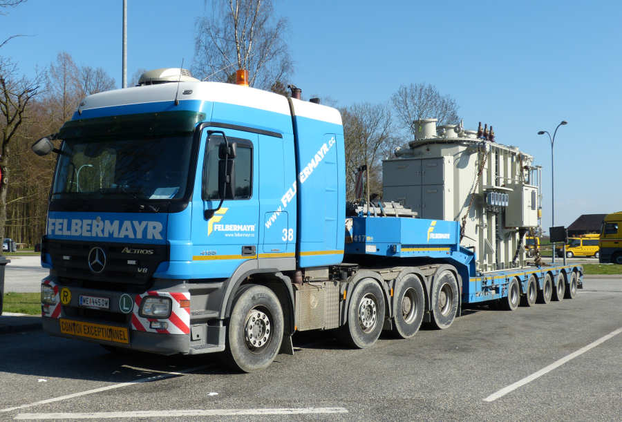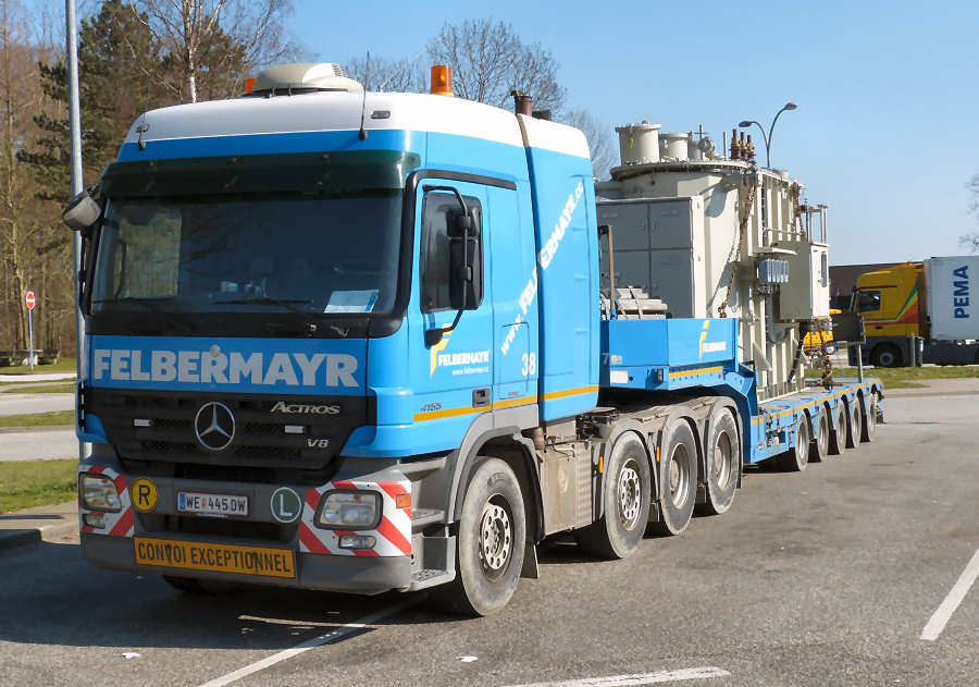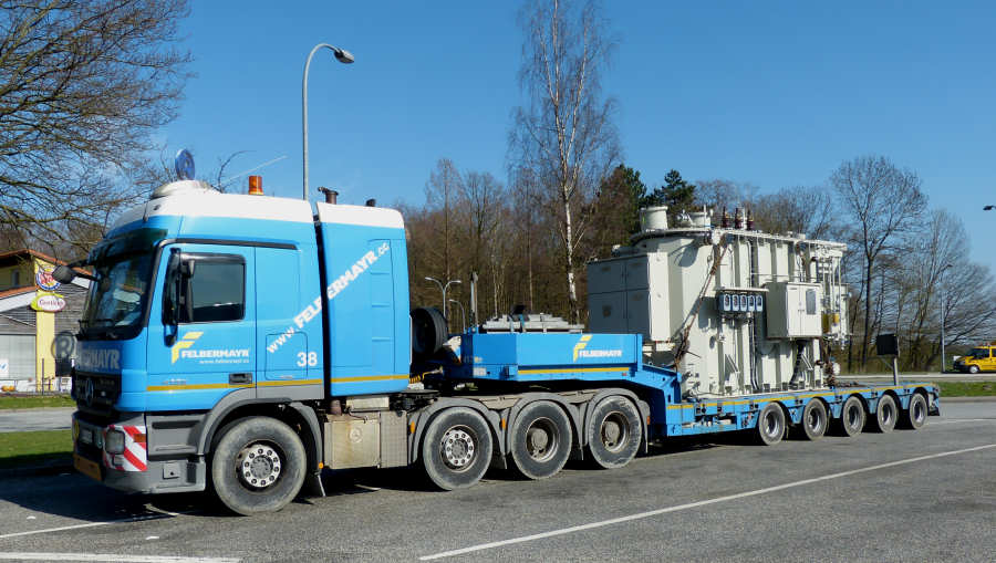Im April 2015 stand dieser kompakte Trafotransport, von Felbermayr aus Wels, auf dem Rasthof Buddikate Ost.