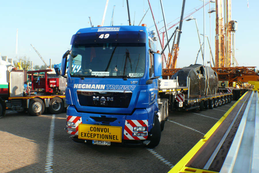 Transport eines Raupenlaufwerkes, eines Liebherr R 9350, für den Export nach Indien.