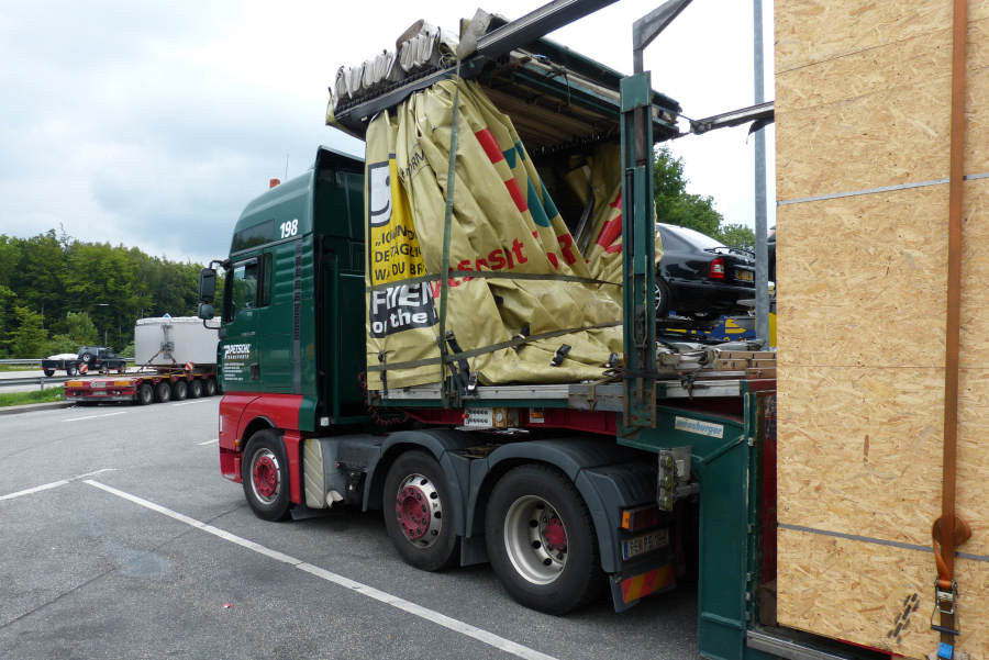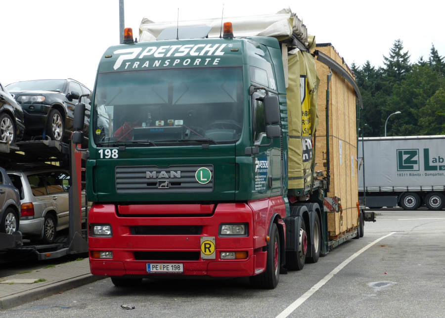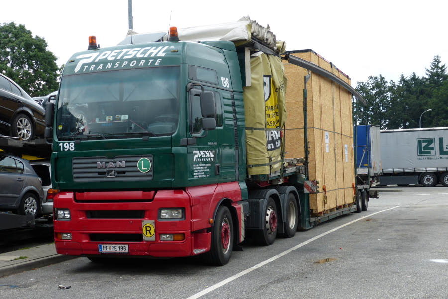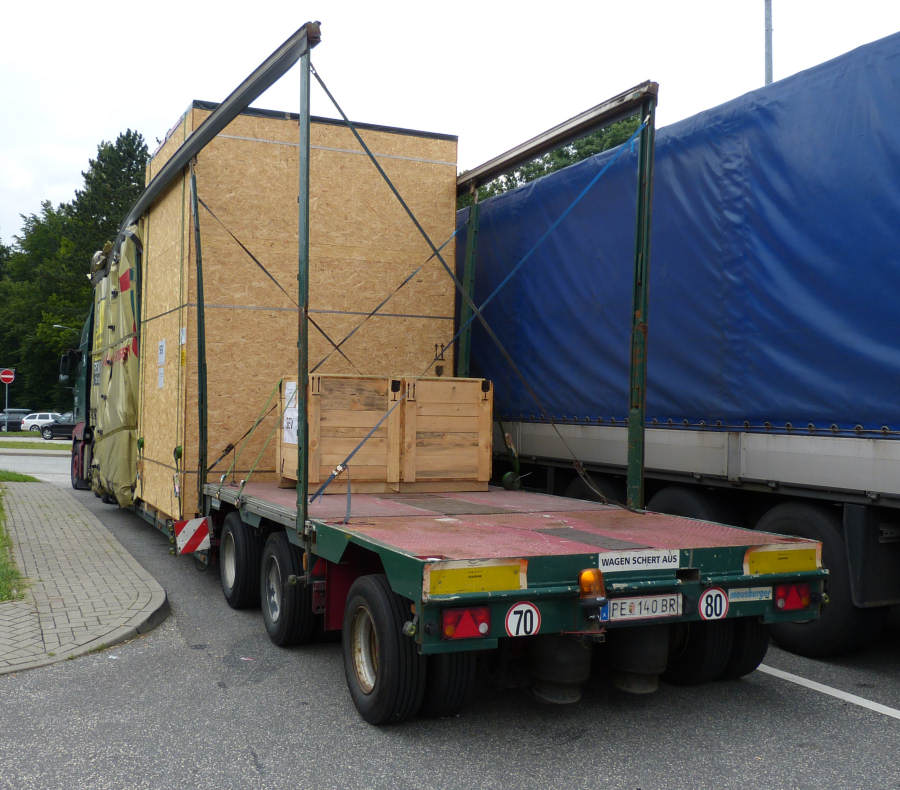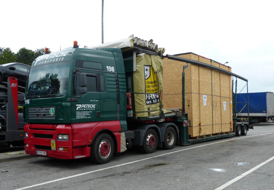MAN TGA 26.480 mit Meusburger Volumenauflieger beladen mit Maschinenkisten