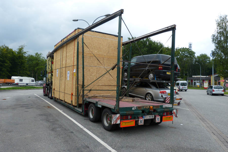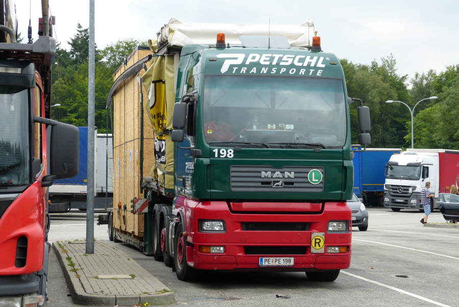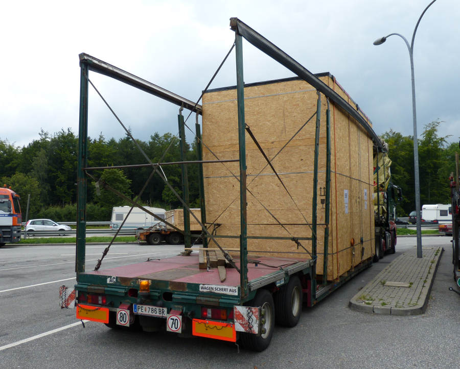 MAN TGA 26.480 mit Meusburger Volumenauflieger beladen mit Maschinenkisten