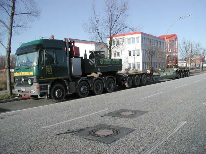Hier zieht die Maschine eine Goldhofer Kesselbettkombination.
